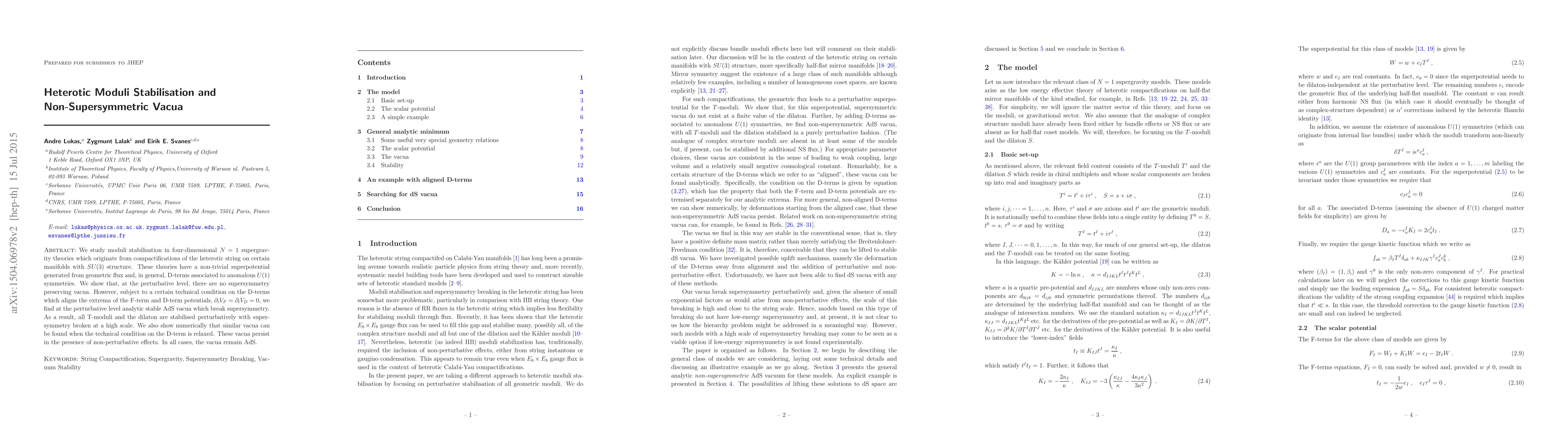 This paper investigates moduli stabilisation in $N=1$ supergravity from heterotic string compactifications, finding no supersymmetric vacua but stabilising moduli in non-supersymmetric, analytic stable AdS vacua under specific D-term conditions. Numerical results show similar stabilisation when these conditions are relaxed.