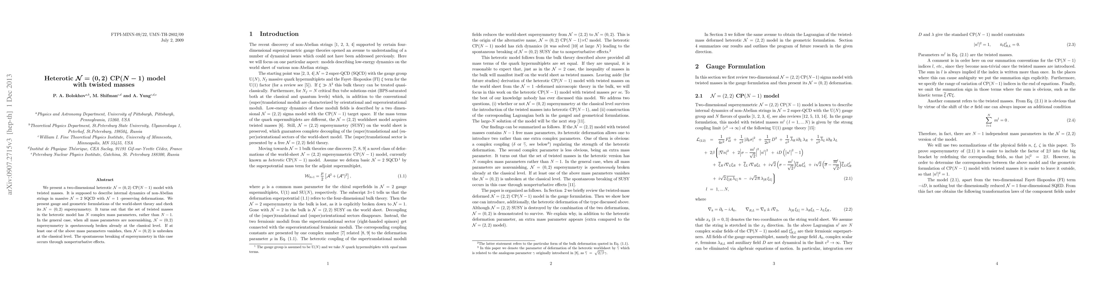 This paper explores a two-dimensional heterotic N=(0,2) CP(N-1) model with twisted masses, describing the dynamics of non-Abelian strings in massive N=2 SQCD. The study reveals that the model has N complex mass parameters, leading to spontaneous breaking of N=(0,2) supersymmetry at the classical level unless at least one mass parameter is zero, in which case breaking occurs nonperturbatively.