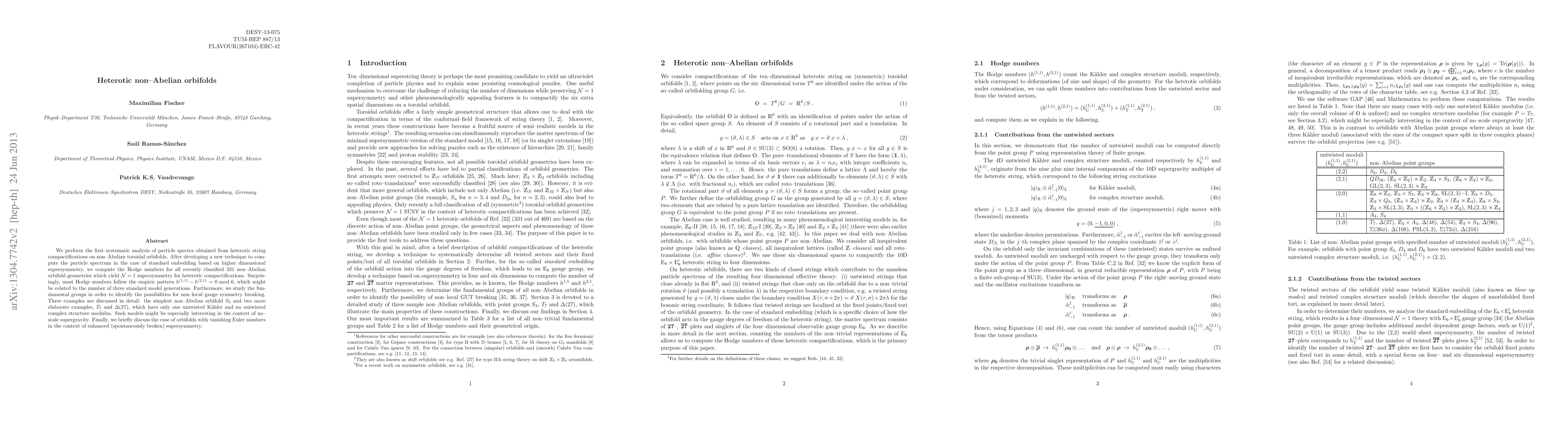 This paper systematically analyzes particle spectra from heterotic string compactifications on non-Abelian toroidal orbifolds, revealing that most Hodge numbers follow a pattern potentially linked to standard model generations. The study also explores fundamental groups for non-local gauge symmetry breaking, highlighting three specific examples and discussing implications for no-scale supergravity and enhanced supersymmetry.