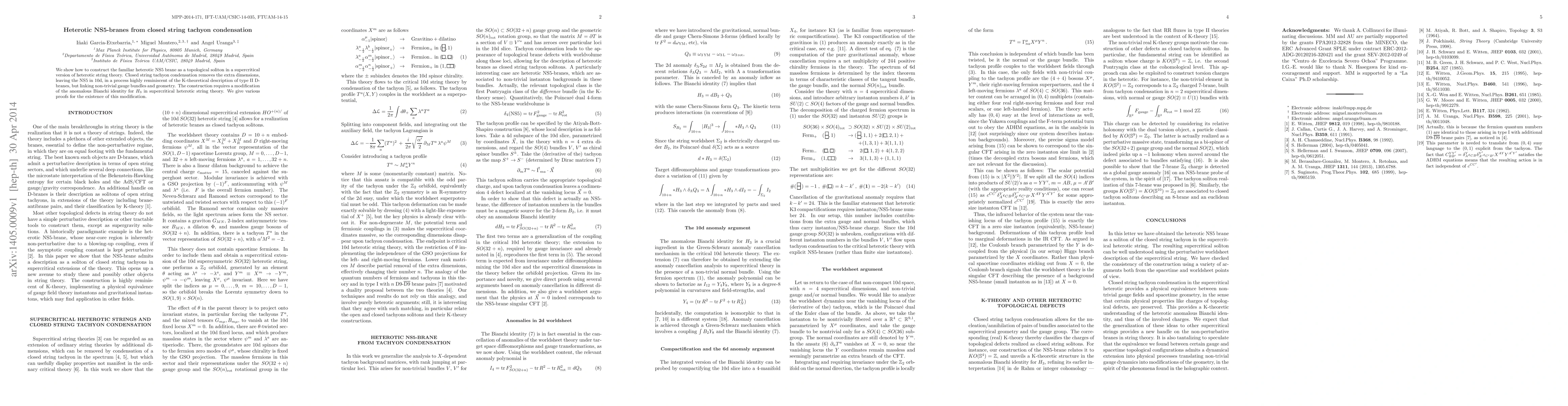This paper constructs heterotic NS5-branes via closed string tachyon condensation in supercritical heterotic string theory, removing extra dimensions and linking non-trivial gauge bundles with geometry. It also modifies the anomalous Bianchi identity for $H_3$ and provides proofs for this modification.