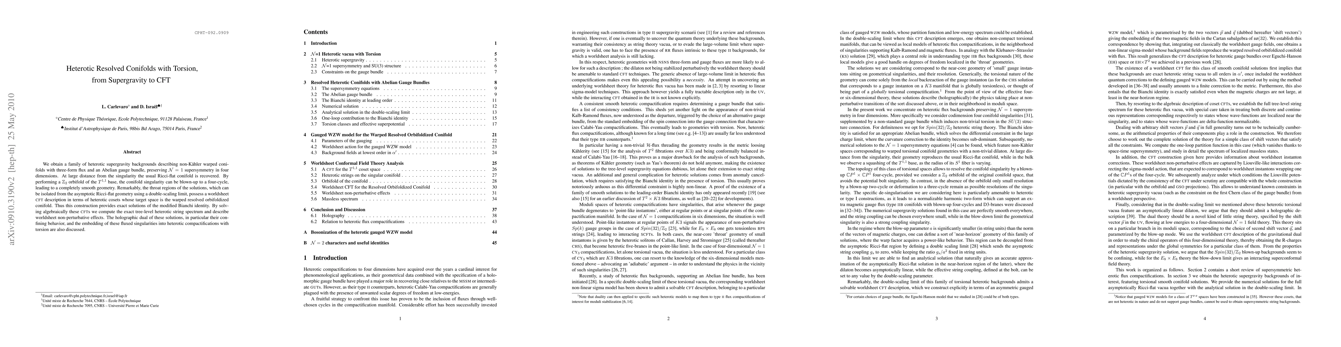 This paper constructs heterotic supergravity backgrounds with resolved conifolds, preserving N=1 supersymmetry, and describes their smooth geometry after a Z_2 orbifold. The throat regions exhibit a worldsheet CFT description, allowing computation of the exact heterotic string spectrum and non-perturbative effects.