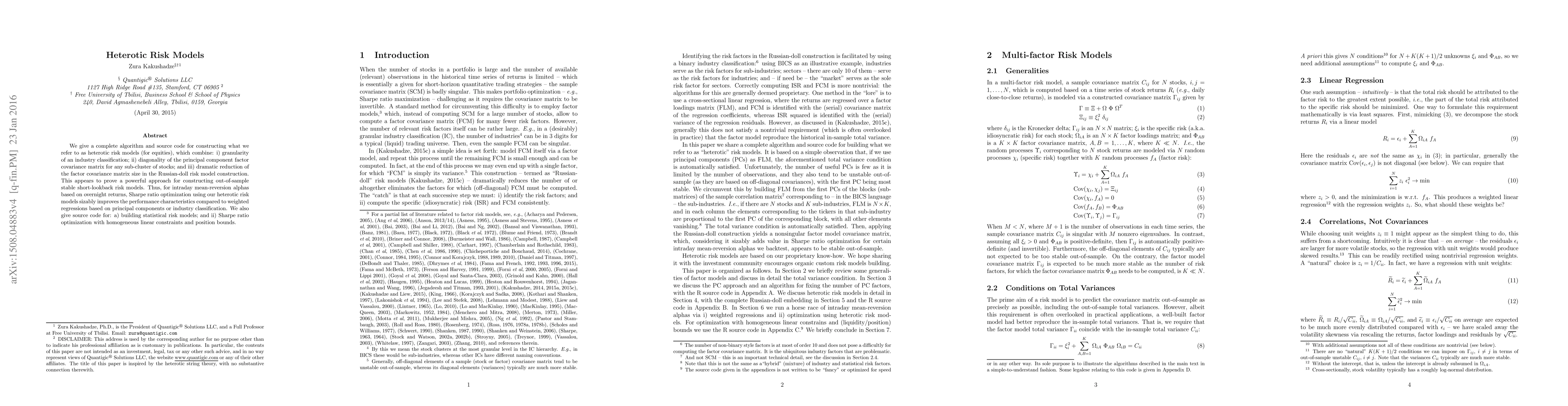 We give a complete algorithm and source code for constructing what we refer to as heterotic risk models (for equities), which combine: i) granularity of an industry classification; ii) diagonality of the principal component factor covariance matrix for any sub-cluster of stocks; and iii) dramatic reduction of the factor covariance matrix size in the Russian-doll risk model construction. This appears to prove a powerful approach for constructing out-of-sample stable short-lookback risk models. Thus, for intraday mean-reversion alphas based on overnight returns, Sharpe ratio optimization using our heterotic risk models sizably improves the performance characteristics compared to weighted regressions based on principal components or industry classification. We also give source code for: a) building statistical risk models; and ii) Sharpe ratio optimization with homogeneous linear constraints and position bounds.