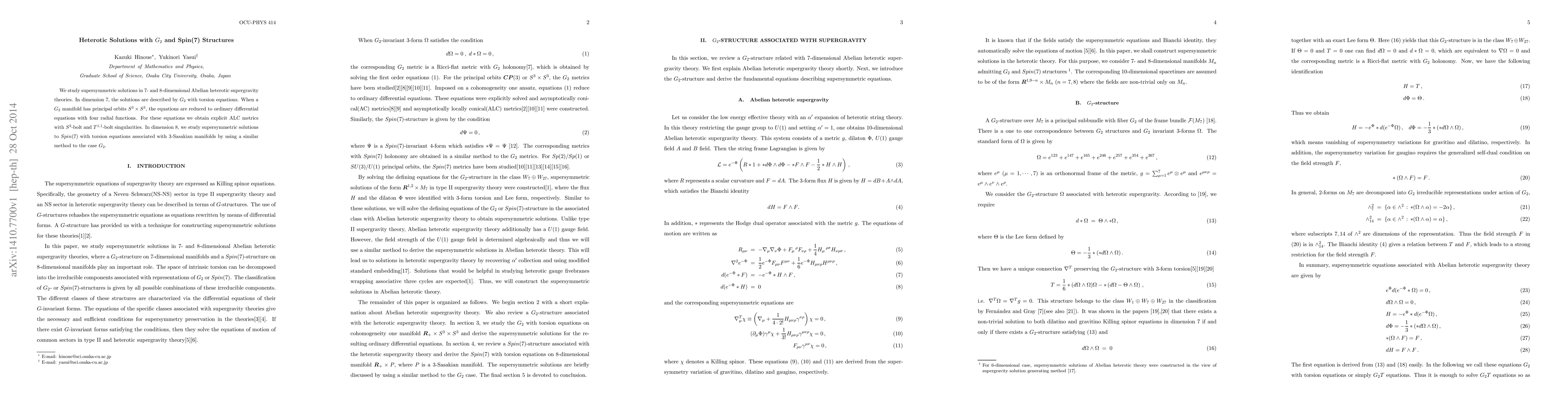 We study supersymmetric solutions in 7- and 8-dimensional Abelian heterotic supergravity theories. In dimension 7, the solutions are described by $G_{2}$ with torsion equations. When a $G_{2}$ manifold has principal orbits $S^{3} \times S^{3}$, the equations are reduced to ordinary differential equations with four radial functions. For these equations we obtain explicit ALC metrics with $S^{3}$-bolt and $T^{1,1}$-bolt singularities. In dimension 8, we study supersymmetric solutions to $Spin(7)$ with torsion equations associated with 3-Sasakian manifolds by using a similar method to the case $G_{2}$.