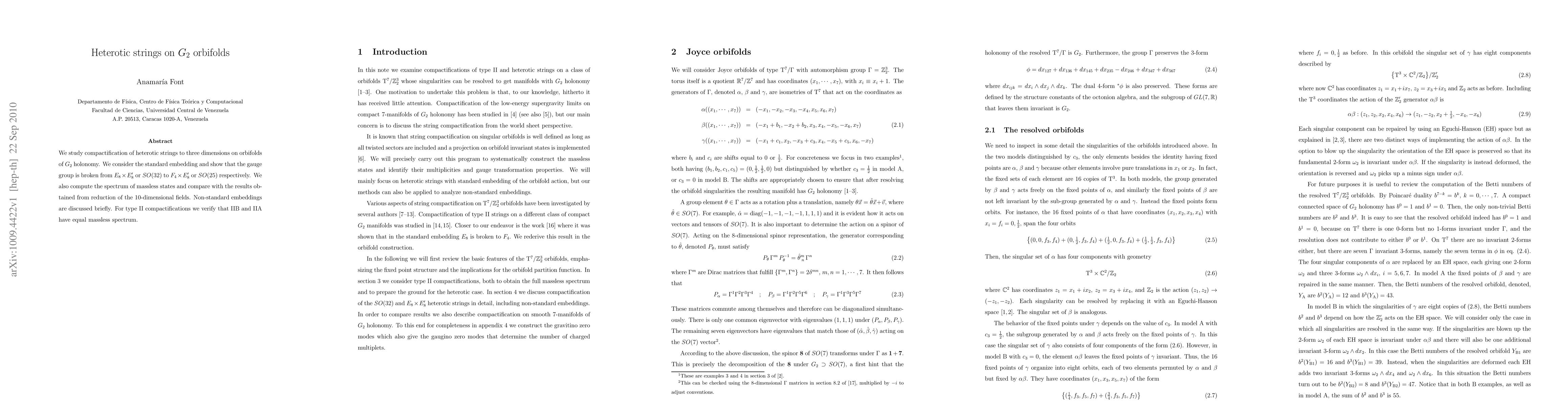 This paper investigates the compactification of heterotic strings in three dimensions on G_2 holonomy orbifolds, revealing gauge group reductions from E_8 x E_8 or SO(32) to F_4 x E_8 or SO(25). It also examines the spectrum of massless states and confirms equal massless spectra between IIB and IIA type II compactifications.