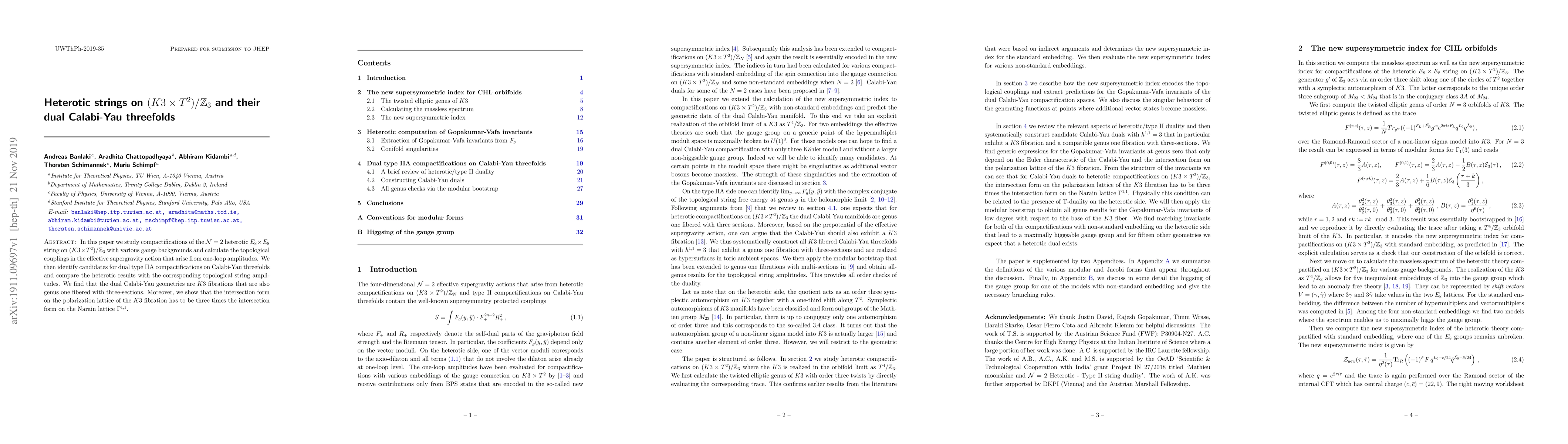 This paper investigates the compactification of the ${\cal N}=2$ heterotic string on a specific orbifold geometry and computes topological couplings from one-loop amplitudes. It identifies dual Calabi-Yau threefolds and finds that they are $K3$ fibrations with genus one fibers and three-sections, matching the intersection form of the polarization lattice with the Narain lattice.