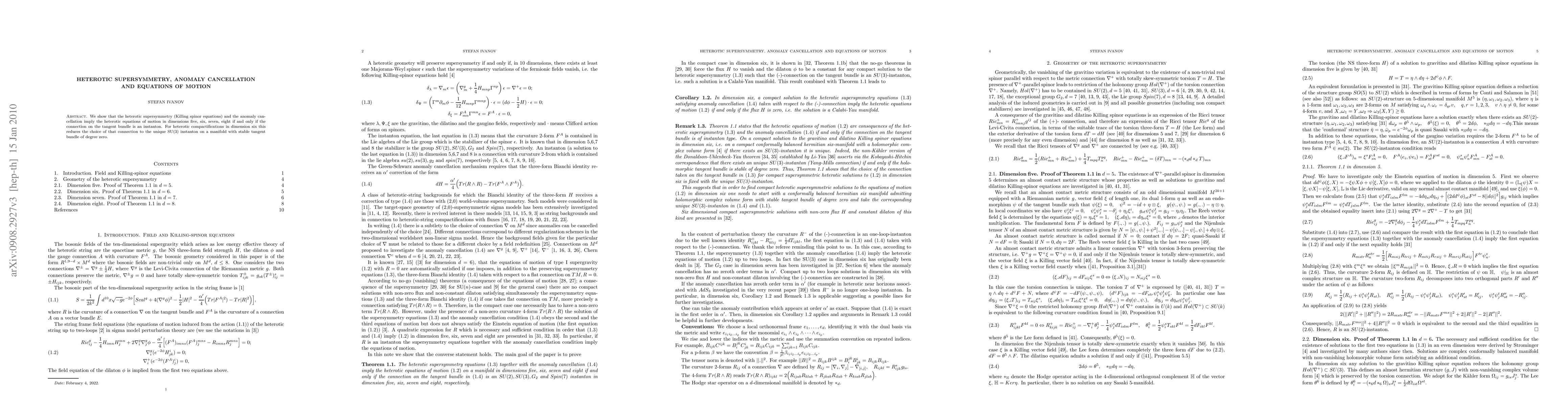 Summary: This paper demonstrates that heterotic supersymmetry and anomaly cancellation imply the heterotic equations of motion in specific dimensions when the connection on the tangent bundle is an instanton, specifically the unique SU(3) instanton in dimension six.