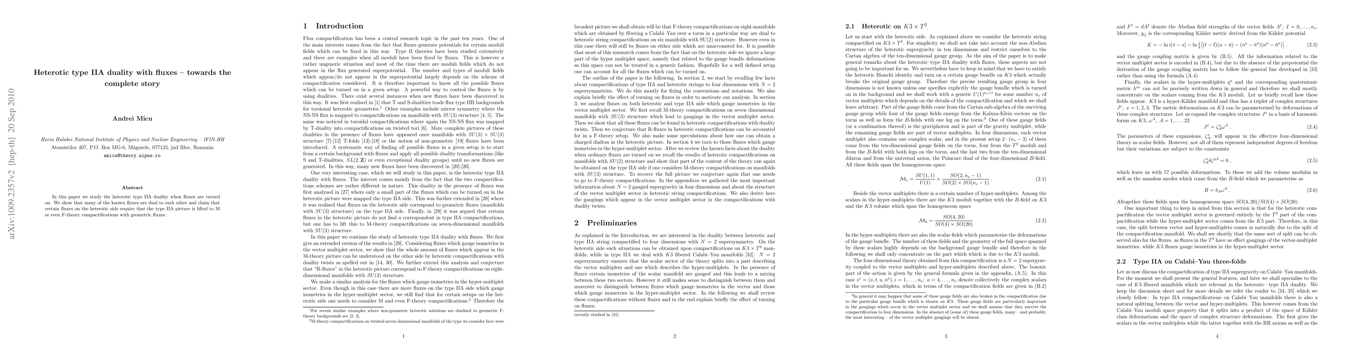 Summary: This paper explores heterotic type IIA duality under flux conditions, demonstrating flux dualities and suggesting that certain heterotic fluxes necessitate lifting the type IIA picture to M-theory or F-theory compactifications involving geometric fluxes.