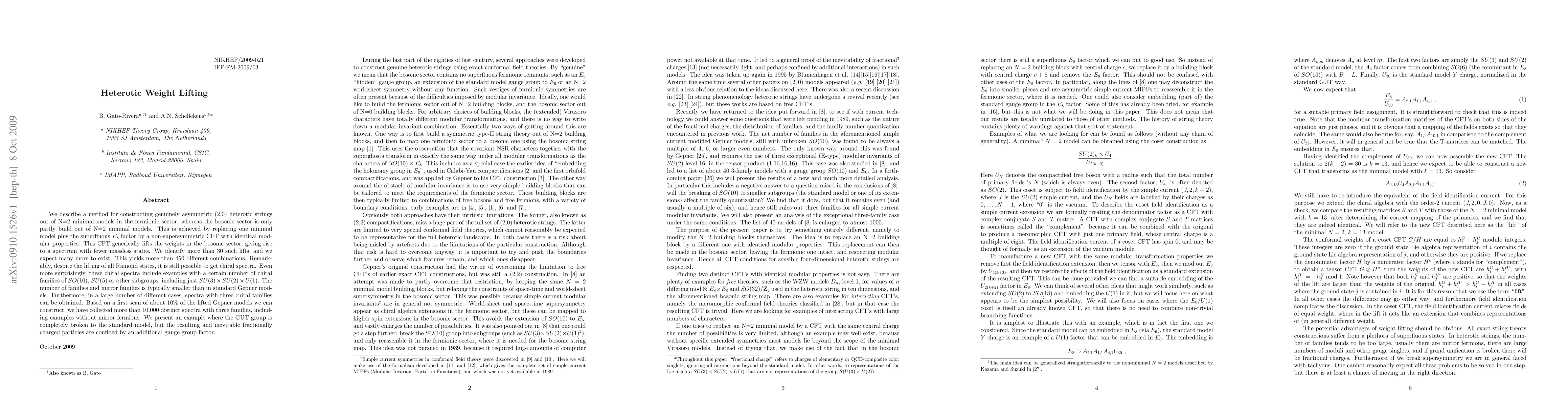 We describe a method for constructing genuinely asymmetric (2,0) heterotic strings out of N=2 minimal models in the fermionic sector, whereas the bosonic sector is only partly build out of N=2 minimal models. This is achieved by replacing one minimal model plus the superfluous E_8 factor by a non-supersymmetric CFT with identical modular properties. This CFT generically lifts the weights in the bosonic sector, giving rise to a spectrum with fewer massless states. We identify more than 30 such lifts, and we expect many more to exist. This yields more than 450 different combinations. Remarkably, despite the lifting of all Ramond states, it is still possible to get chiral spectra. Even more surprisingly, these chiral spectra include examples with a certain number of chiral families of SO(10), SU(5) or other subgroups, including just SU(3) x SU(2) x U(1). The number of families and mirror families is typically smaller than in standard Gepner models. Furthermore, in a large number of different cases, spectra with three chiral families can be obtained. Based on a first scan of about 10% of the lifted Gepner models we can construct, we have collected more than 10.000 distinct spectra with three families, including examples without mirror fermions. We present an example where the GUT group is completely broken to the standard model, but the resulting and inevitable fractionally charged particles are confined by an additional gauge group factor.