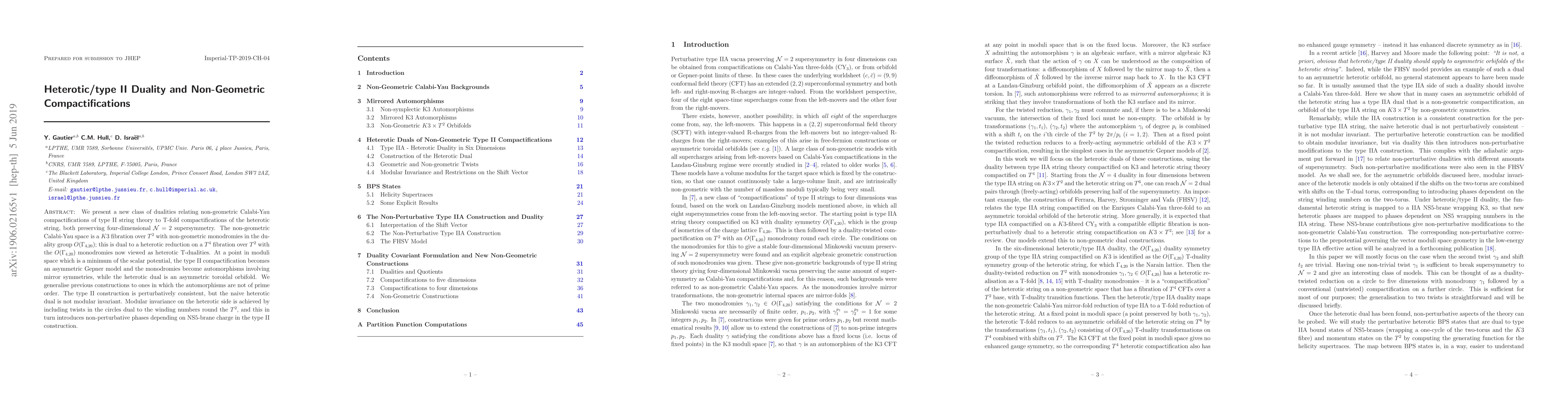 We present a new class of dualities relating non-geometric Calabi-Yau compactifications of type II string theory to T-fold compactifications of the heterotic string, both preserving four-dimensional $\mathcal{N}=2$ supersymmetry. The non-geometric Calabi-Yau space is a $K3$ fibration over $T^2$ with non-geometric monodromies in the duality group $O(\Gamma_{4,20})$; this is dual to a heterotic reduction on a $T^4$ fibration over $T^2$ with the $O(\Gamma_{4,20})$ monodromies now viewed as heterotic T-dualities. At a point in moduli space which is a minimum of the scalar potential, the type II compactification becomes an asymmetric Gepner model and the monodromies become automorphisms involving mirror symmetries, while the heterotic dual is an asymmetric toroidal orbifold. We generalise previous constructions to ones in which the automorphisms are not of prime order. The type II construction is perturbatively consistent, but the naive heterotic dual is not modular invariant. Modular invariance on the heterotic side is achieved by including twists in the circles dual to the winding numbers round the $T^2$, and this in turn introduces non-perturbative phases depending on NS5-brane charge in the type II construction.