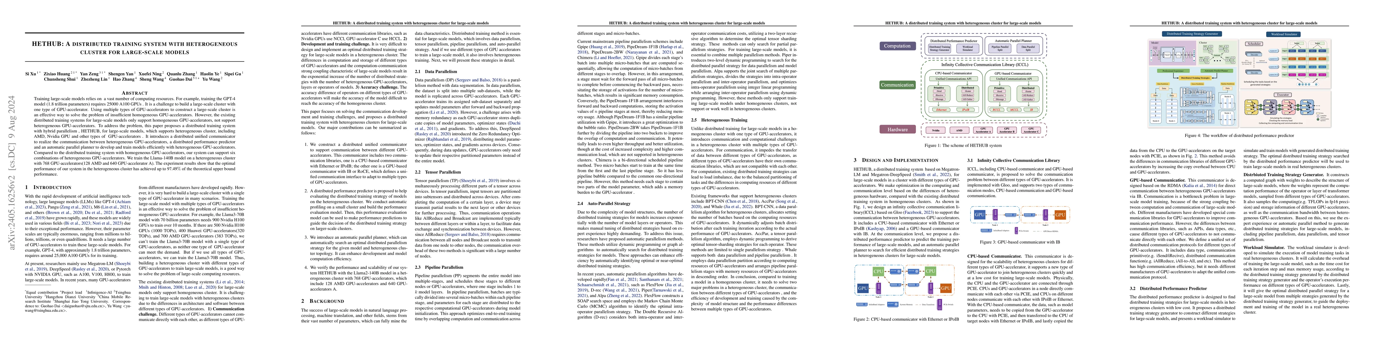 HetHub introduces a distributed hybrid training system to efficiently utilize multiple types of GPU-accelerators for large-scale model training, achieving nearly optimal performance and supporting various heterogeneous GPU combinations.