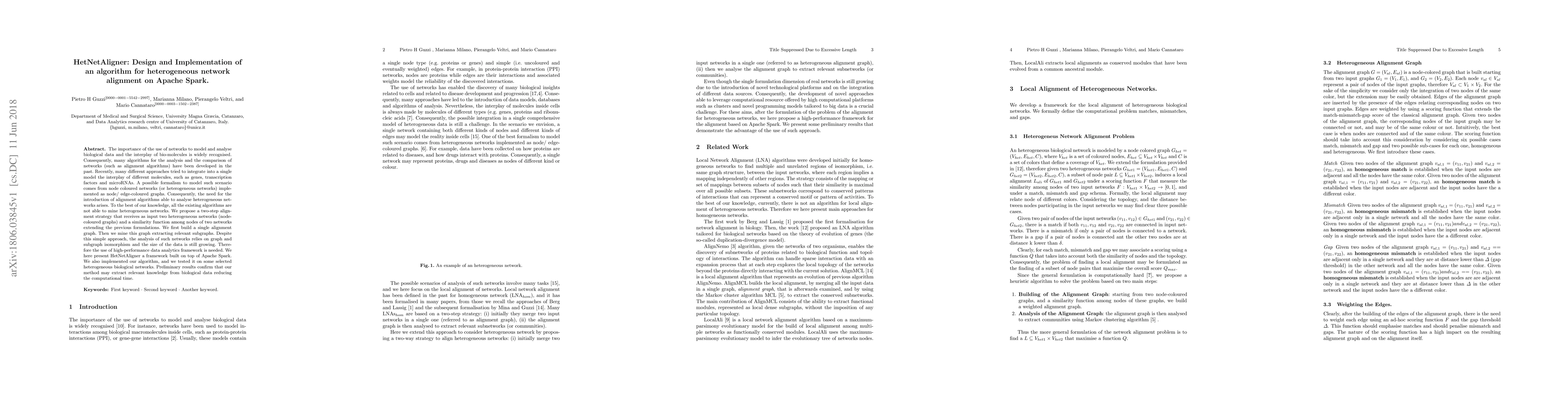 The importance of the use of networks to model and analyse biological data and the interplay of bio-molecules is widely recognised. Consequently, many algorithms for the analysis and the comparison of networks (such as alignment algorithms) have been developed in the past. Recently, many different approaches tried to integrate into a single model the interplay of different molecules, such as genes, transcription factors and microRNAs. A possible formalism to model such scenario comes from node coloured networks (or heterogeneous networks) implemented as node/ edge-coloured graphs. Consequently, the need for the introduction of alignment algorithms able to analyse heterogeneous networks arises. To the best of our knowledge, all the existing algorithms are not able to mine heterogeneous networks. We propose a two-step alignment strategy that receives as input two heterogeneous networks (node-coloured graphs) and a similarity function among nodes of two networks extending the previous formulations. We first build a single alignment graph. Then we mine this graph extracting relevant subgraphs. Despite this simple approach, the analysis of such networks relies on graph and subgraph isomorphism and the size of the data is still growing. Therefore the use of high-performance data analytics framework is needed. We here present HetNetAligner a framework built on top of Apache Spark. We also implemented our algorithm, and we tested it on some selected heterogeneous biological networks. Preliminary results confirm that our method may extract relevant knowledge from biological data reducing the computational time.