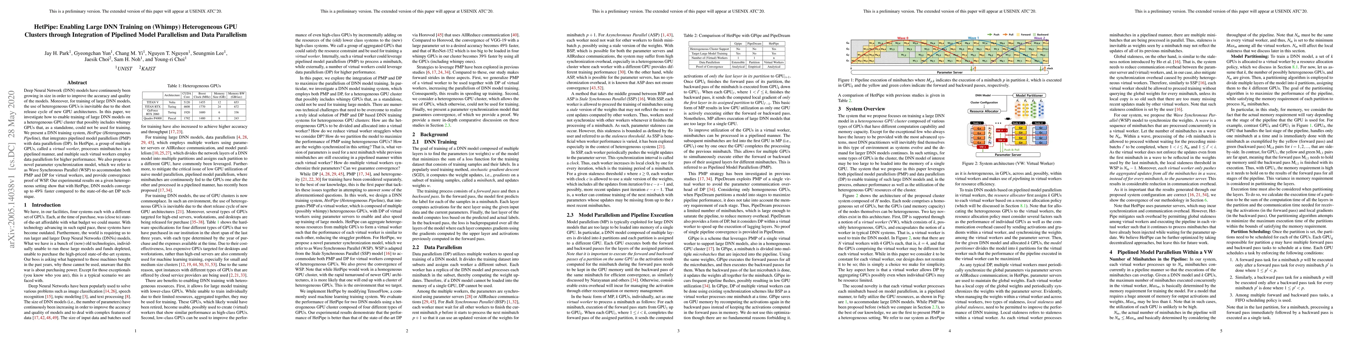 HetPipe integrates pipelined model parallelism with data parallelism to enable efficient training of large DNN models on heterogeneous GPU clusters, including those with underperforming GPUs, achieving up to 49% faster convergence than state-of-the-art data parallelism techniques.