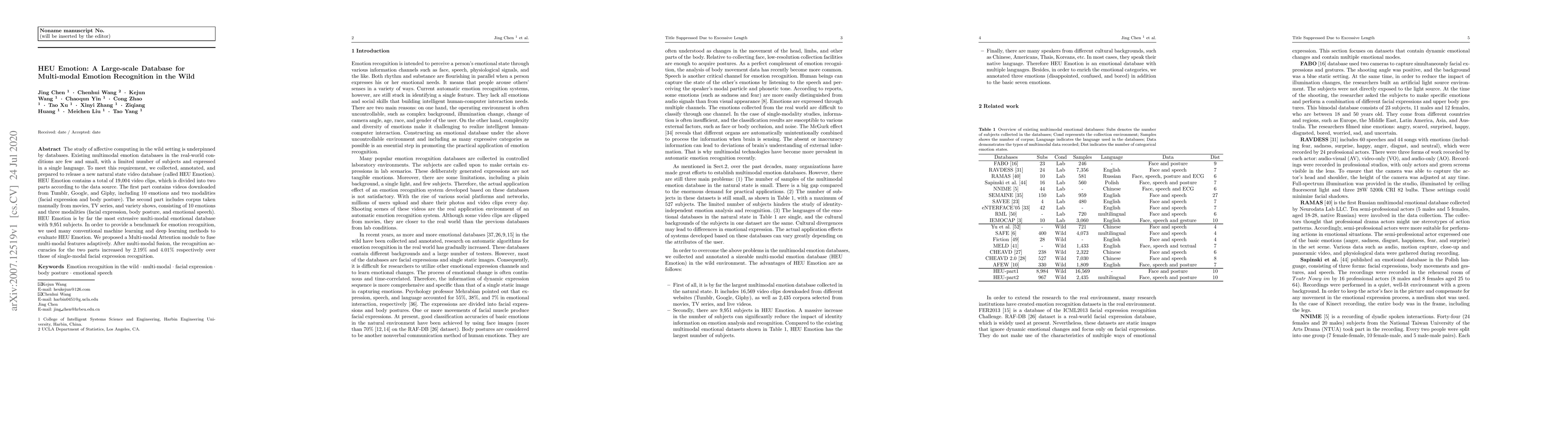 HEU Emotion is a large-scale multi-modal database for emotion recognition in real-world settings, containing 19,004 video clips with 10 emotions and three modalities. The database aims to improve emotion recognition benchmarks using advanced machine learning and deep learning techniques.