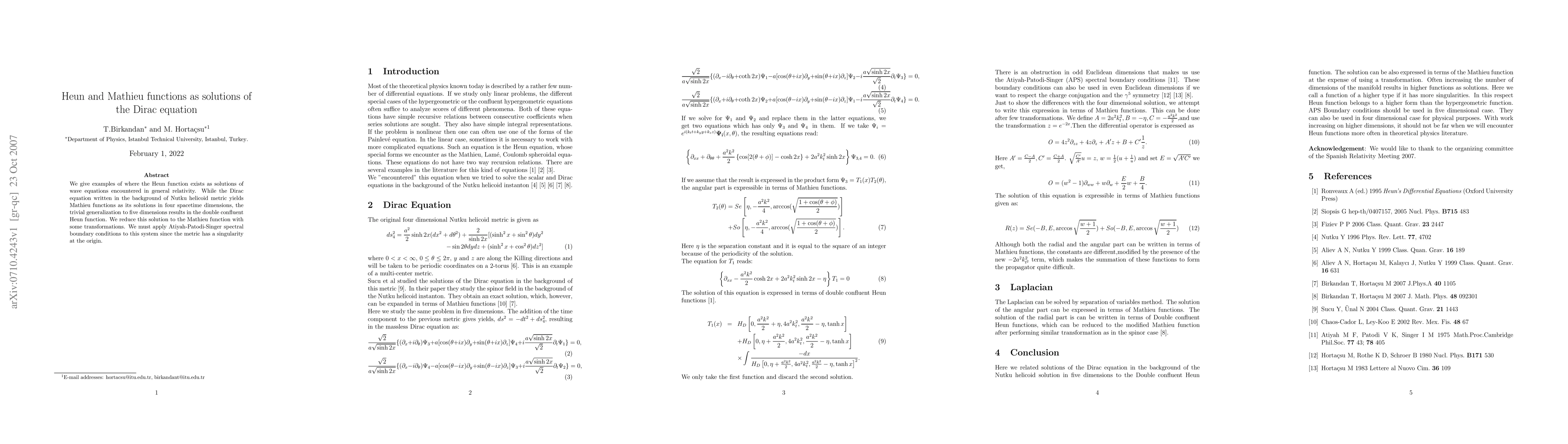 We give examples of where the Heun function exists as solutions of wave equations encountered in general relativity. While the Dirac equation written in the background of Nutku helicoid metric yields Mathieu functions as its solutions in four spacetime dimensions, the trivial generalization to five dimensions results in the double confluent Heun function. We reduce this solution to the Mathieu function with some transformations. We must apply Atiyah-Patodi-Singer spectral boundary conditions to this system since the metric has a singularity at the origin.