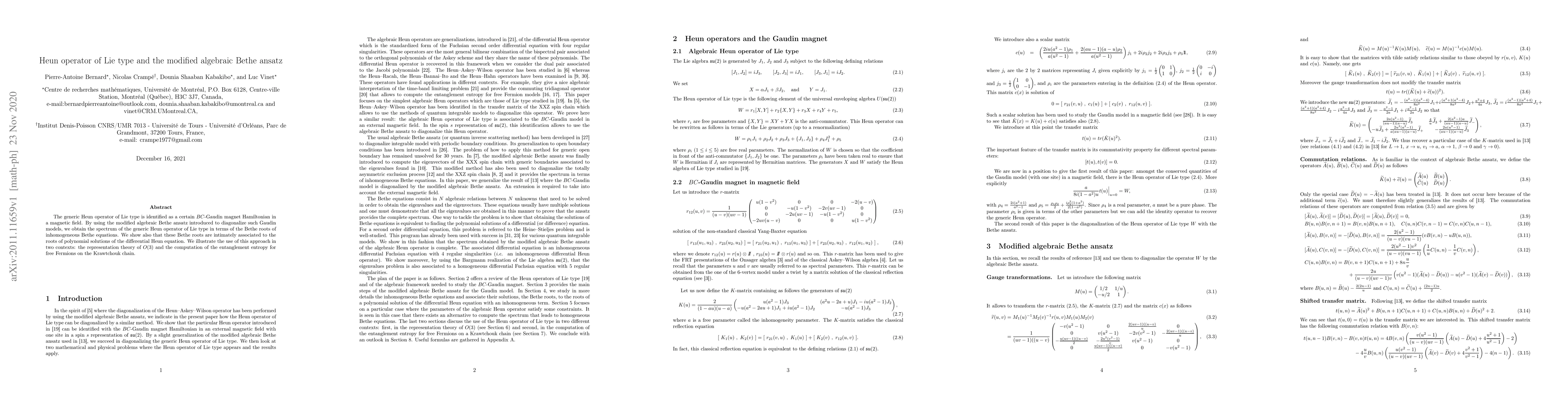 The paper identifies the generic Heun operator of Lie type as a $BC$-Gaudin magnet Hamiltonian, and uses the modified algebraic Bethe ansatz to determine its spectrum in terms of Bethe roots. It also demonstrates the connection between these roots and the solutions of the differential Heun equation, applying this approach to representation theory of $O(3)$ and computing entanglement entropy for free fermions on the Krawtchouk chain.