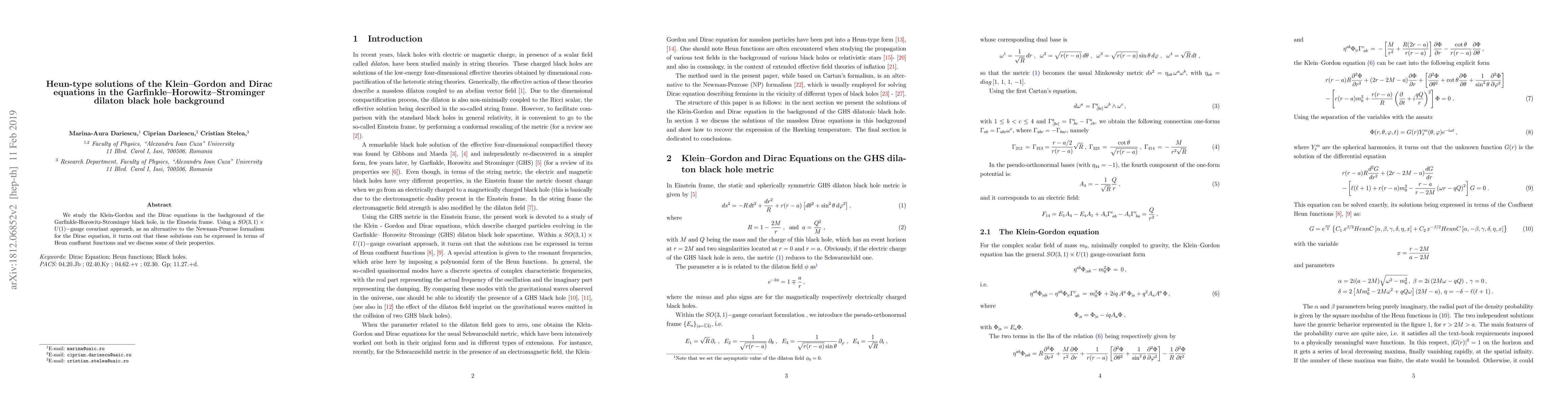 This paper investigates the Klein-Gordon and Dirac equations in the Garfinkle-Horowitz-Strominger black hole background, presenting solutions expressed via Heun confluent functions through an $SO(3,1) \times U(1)$-gauge covariant approach. The study highlights properties of these newly derived functions.