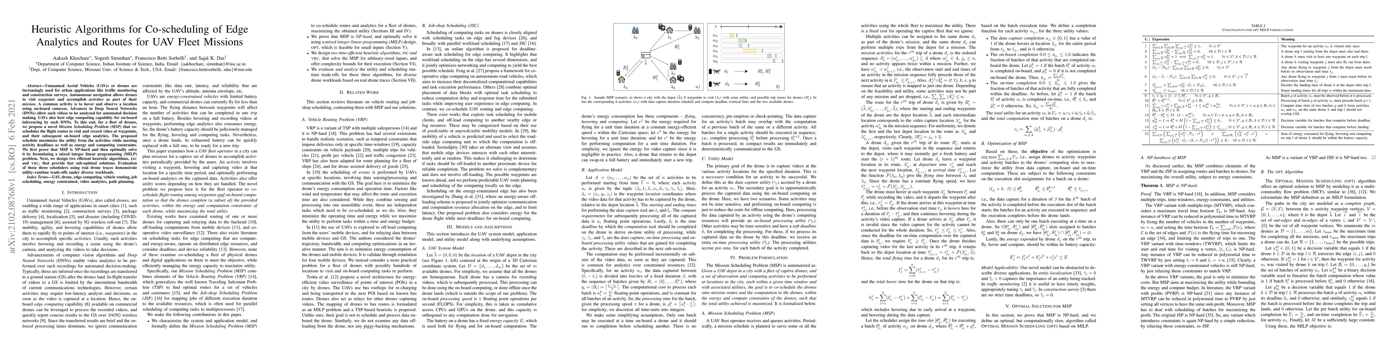 This research introduces a novel Mission Scheduling Problem (MSP) for coordinating flight routes and on-board edge analytics of UAV fleet missions, proving MSP's NP-hardness and solving it optimally via MILP. Two efficient heuristic algorithms, JSC and VRC, are designed for fast sub-optimal solutions, demonstrating utility-runtime trade-offs using real drone traces.