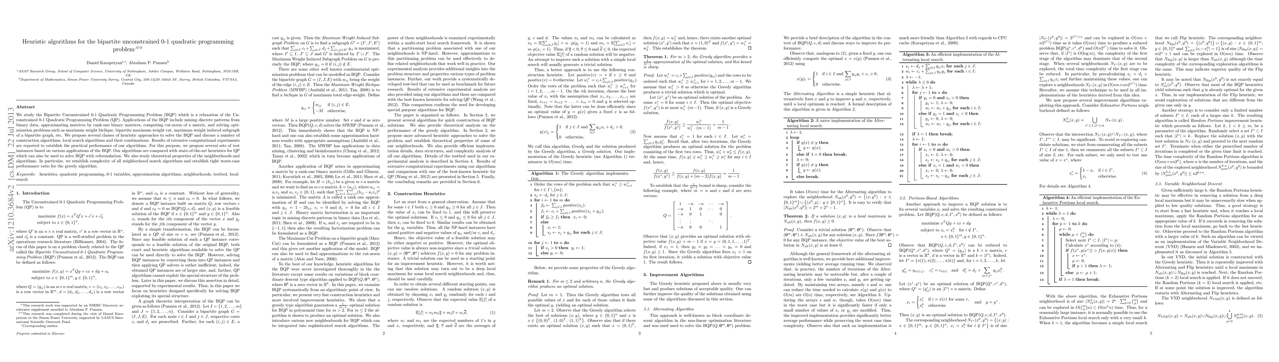 This paper proposes heuristic algorithms for solving the Bipartite Unconstrained 0-1 Quadratic Programming Problem (BQP), which is used in various applications like mining discrete patterns and computing matrix cut-norms. The study compares proposed construction and local search algorithms with state-of-the-art heuristics, reporting computational experiments and establishing theoretical complexity and performance ratios.