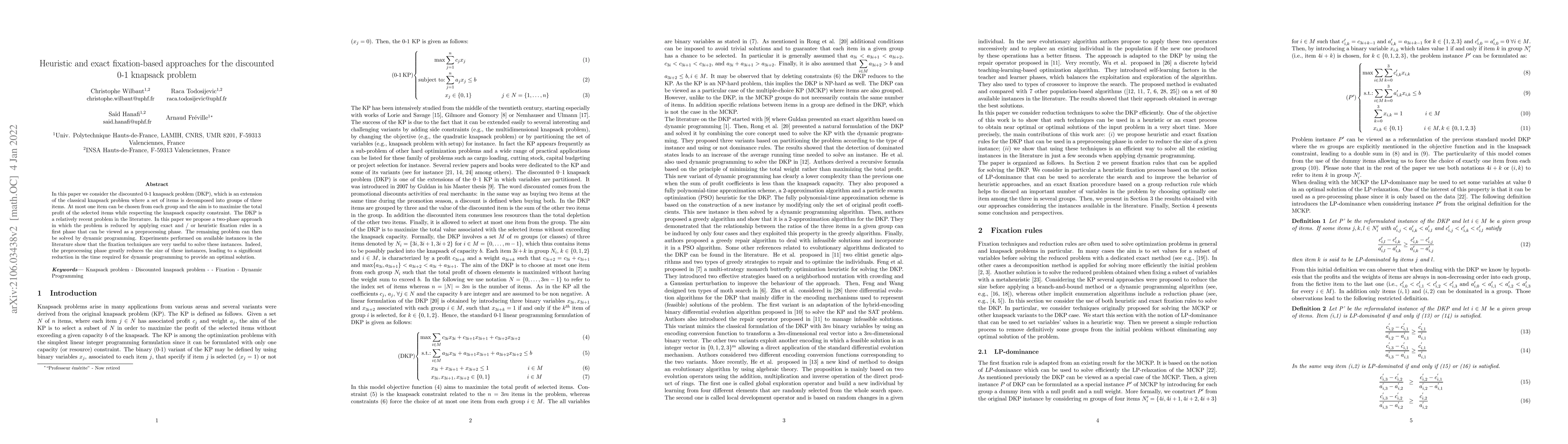 This paper proposes a two-phase approach to solve the discounted 0-1 knapsack problem (DKP), utilizing exact and heuristic fixation rules to preprocess and reduce the problem size. Dynamic programming then solves the remaining problem, demonstrating significant reductions in computational time through effective preprocessing.