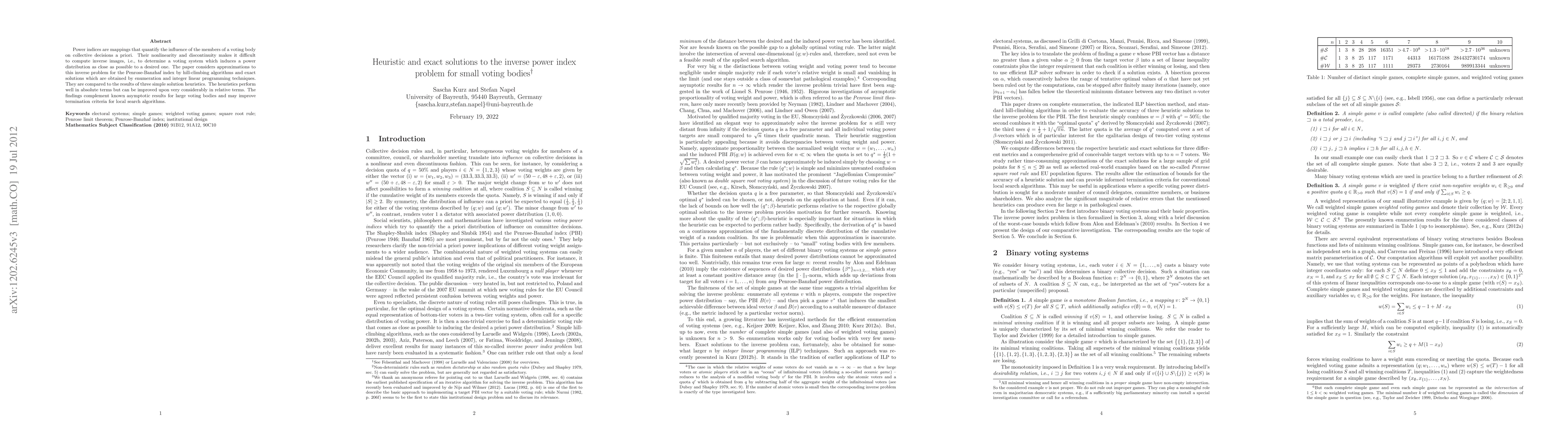 This paper presents exact and heuristic solutions for the inverse power index problem, specifically the Penrose-Banzhaf index, using enumeration and integer linear programming. The methods are compared to simple heuristics, showing improved performance in relative terms, complementing existing results for larger voting bodies and potentially enhancing local search algorithm criteria.