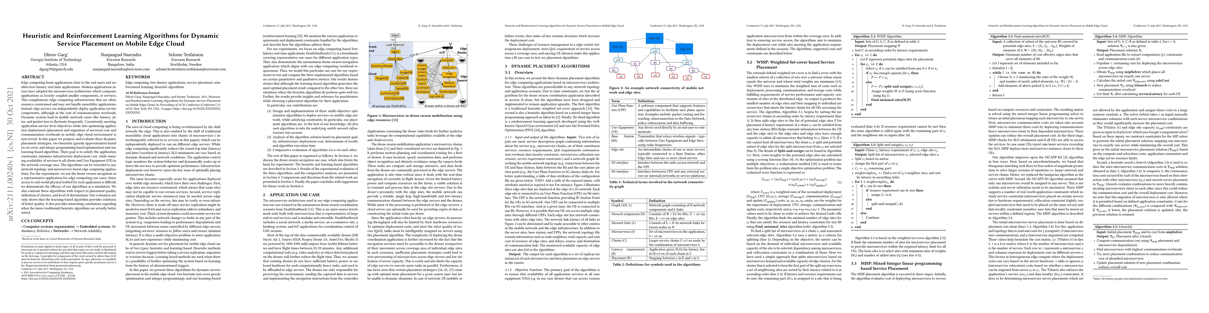 Edge computing hosts applications close to the end users and enables low-latency real-time applications. Modern applications inturn have adopted the microservices architecture which composes applications as loosely coupled smaller components, or services. This complements edge computing infrastructure that are often resource constrained and may not handle monolithic applications. Instead, edge servers can independently deploy application service components, although at the cost of communication overheads. Consistently meeting application service level objectives while also optimizing application deployment (placement and migration of services) cost and communication overheads in mobile edge cloud environment is non-trivial. In this paper we propose and evaluate three dynamic placement strategies, two heuristic (greedy approximation based on set cover, and integer programming based optimization) and one learning-based algorithm. Their goal is to satisfy the application constraints, minimize infrastructure deployment cost, while ensuring availability of services to all clients and User Equipment (UE) in the network coverage area. The algorithms can be extended to any network topology and microservice based edge computing applications. For the experiments, we use the drone swarm navigation as a representative application for edge computing use cases. Since access to real-world physical testbed for such application is difficult, we demonstrate the efficacy of our algorithms as a simulation. We also contrast these algorithms with respect to placement quality, utilization of clusters, and level of determinism. Our evaluation not only shows that the learning-based algorithm provides solutions of better quality; it also provides interesting conclusions regarding when the (more traditional) heuristic algorithms are actually better suited.