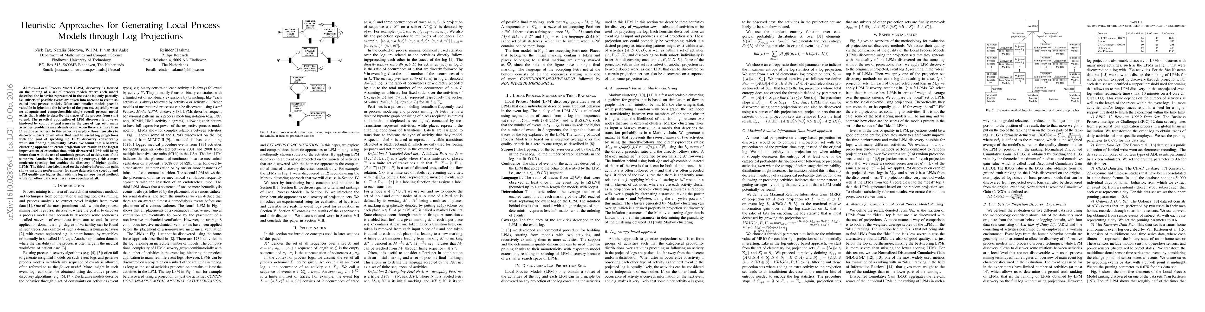 Local Process Model (LPM) discovery is focused on the mining of a set of process models where each model describes the behavior represented in the event log only partially, i.e. subsets of possible events are taken into account to create so-called local process models. Often such smaller models provide valuable insights into the behavior of the process, especially when no adequate and comprehensible single overall process model exists that is able to describe the traces of the process from start to end. The practical application of LPM discovery is however hindered by computational issues in the case of logs with many activities (problems may already occur when there are more than 17 unique activities). In this paper, we explore three heuristics to discover subsets of activities that lead to useful log projections with the goal of speeding up LPM discovery considerably while still finding high-quality LPMs. We found that a Markov clustering approach to create projection sets results in the largest improvement of execution time, with discovered LPMs still being better than with the use of randomly generated activity sets of the same size. Another heuristic, based on log entropy, yields a more moderate speedup, but enables the discovery of higher quality LPMs. The third heuristic, based on the relative information gain, shows unstable performance: for some data sets the speedup and LPM quality are higher than with the log entropy based method, while for other data sets there is no speedup at all.