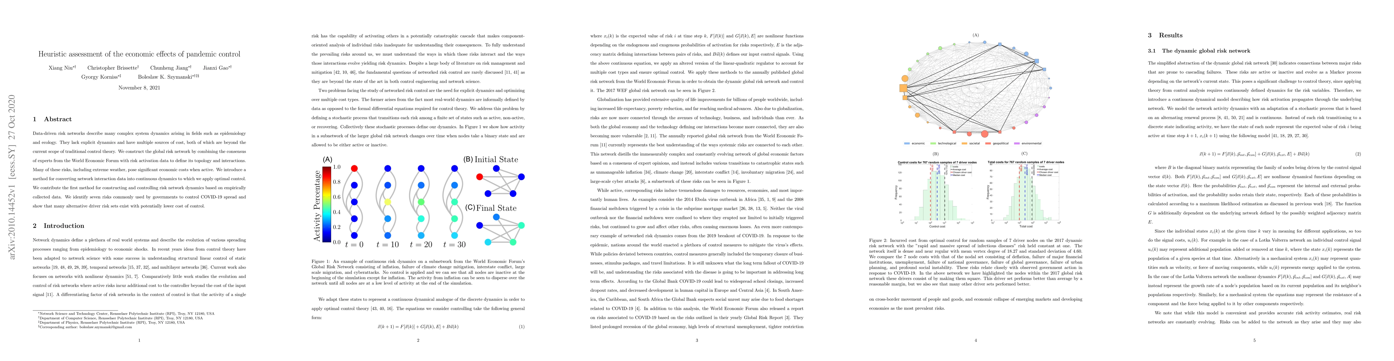 Data-driven risk networks describe many complex system dynamics arising in fields such as epidemiology and ecology. They lack explicit dynamics and have multiple sources of cost, both of which are beyond the current scope of traditional control theory. We construct the global risk network by combining the consensus of experts from the World Economic Forum with risk activation data to define its topology and interactions. Many of these risks, including extreme weather, pose significant economic costs when active. We introduce a method for converting network interaction data into continuous dynamics to which we apply optimal control. We contribute the first method for constructing and controlling risk network dynamics based on empirically collected data. We identify seven risks commonly used by governments to control COVID-19 spread and show that many alternative driver risk sets exist with potentially lower cost of control.