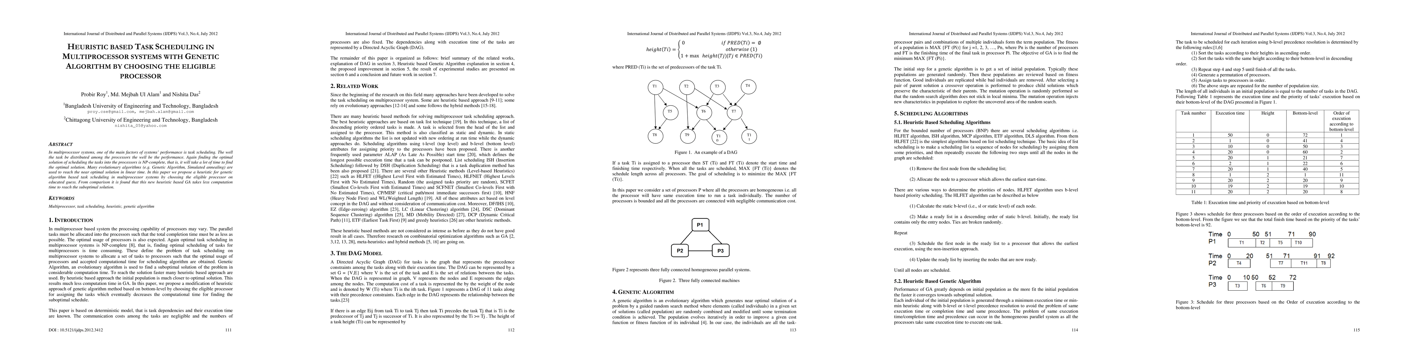 This paper proposes a heuristic-based genetic algorithm for task scheduling in multiprocessor systems, aiming to select the most suitable processor to optimize performance. The new heuristic reduces computation time compared to traditional methods, achieving near-optimal task distribution in linear time.