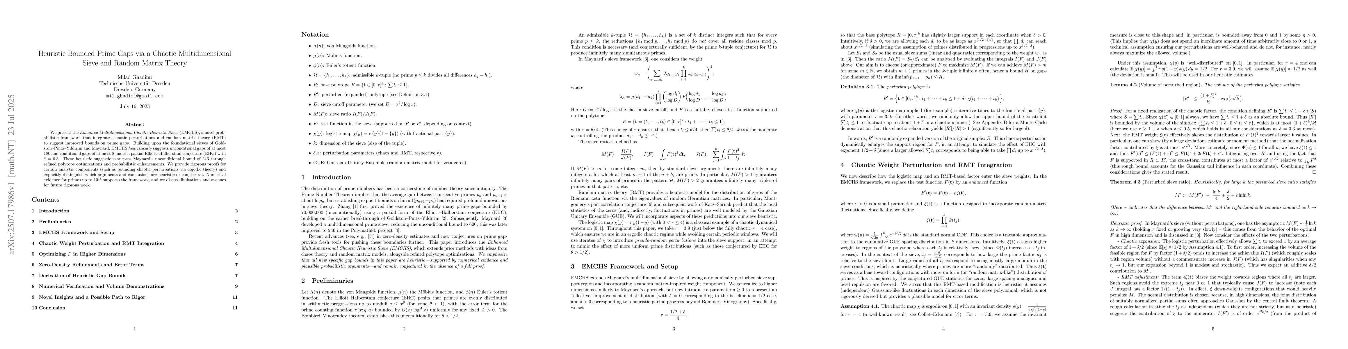 We present the Enhanced Multidimensional Chaotic Heuristic Sieve (EMCHS), a novel probabilistic framework that integrates chaotic perturbations and random matrix theory (RMT) to suggest improved bounds on prime gaps. Building upon the foundational sieves of Goldston-Pintz-Yildirim and Maynard, EMCHS heuristically suggests unconditional gaps of at most 180 and conditional gaps of at most 8 under a partial Elliott-Halberstam conjecture (EHC) with delta = 0.3. These heuristic suggestions surpass Maynard's unconditional bound of 246 through refined polytope optimizations and probabilistic enhancements. We provide rigorous proofs for certain analytic components (such as bounding chaotic perturbations via ergodic theory) and explicitly distinguish which arguments and conclusions are heuristic or conjectural. Numerical evidence for primes up to 10^18 supports the framework, and we discuss limitations and avenues for future rigorous work.