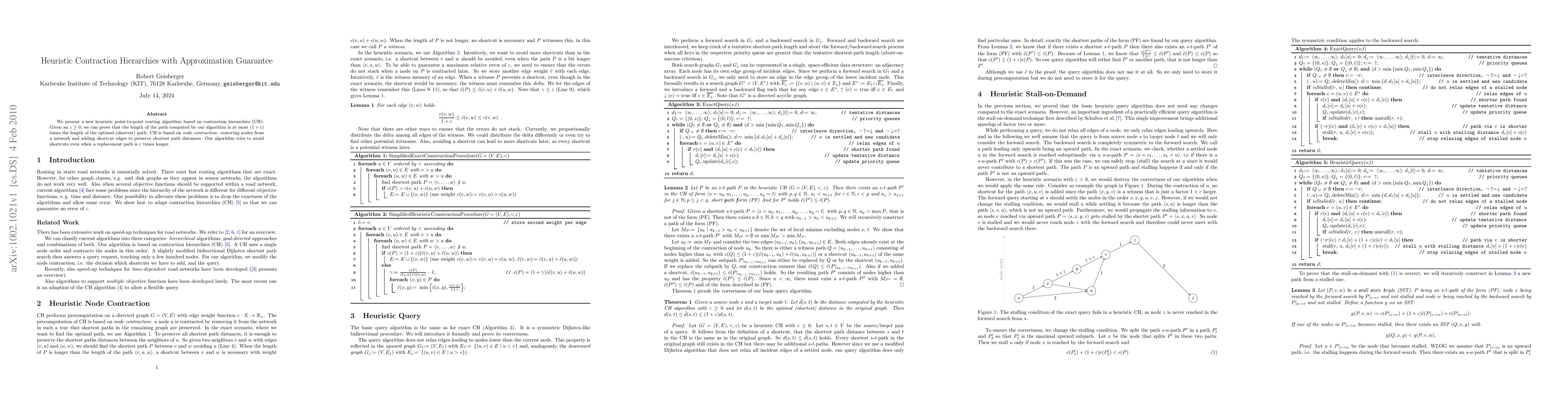 We present a new heuristic point-to-point routing algorithm based on contraction hierarchies (CH). Given an epsilon >= 0, we can prove that the length of the path computed by our algorithm is at most (1+epsilon) times the length of the optimal (shortest) path. CH is based on node contraction: removing nodes from a network and adding shortcut edges to preserve shortest path distances. Our algorithm tries to avoid shortcuts even when a replacement path is epsilon times longer.