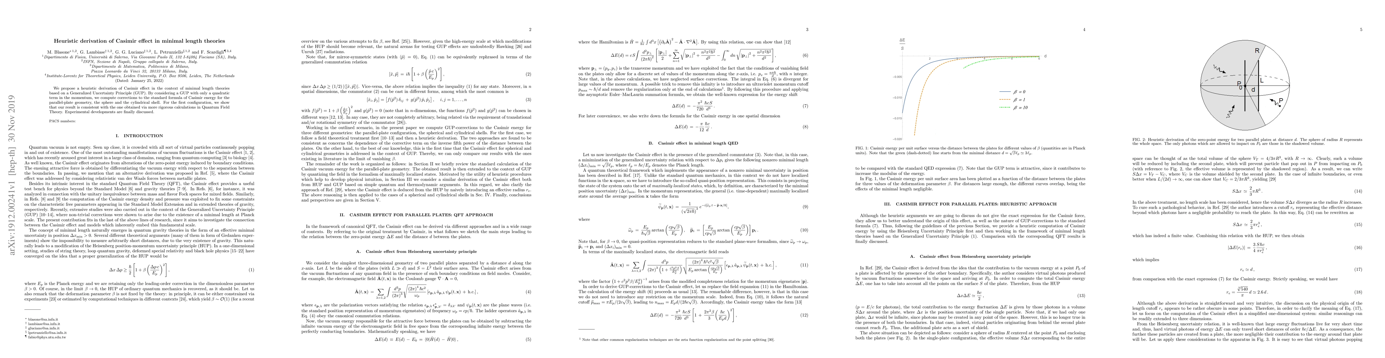 This paper proposes a heuristic derivation of the Casimir effect within minimal length theories using a Generalized Uncertainty Principle (GUP) with a quadratic momentum term. It computes corrections to the standard Casimir energy formula for parallel plates, spheres, and cylindrical shells, showing consistency with Quantum Field Theory results for the parallel-plate configuration, and discusses potential experimental developments.