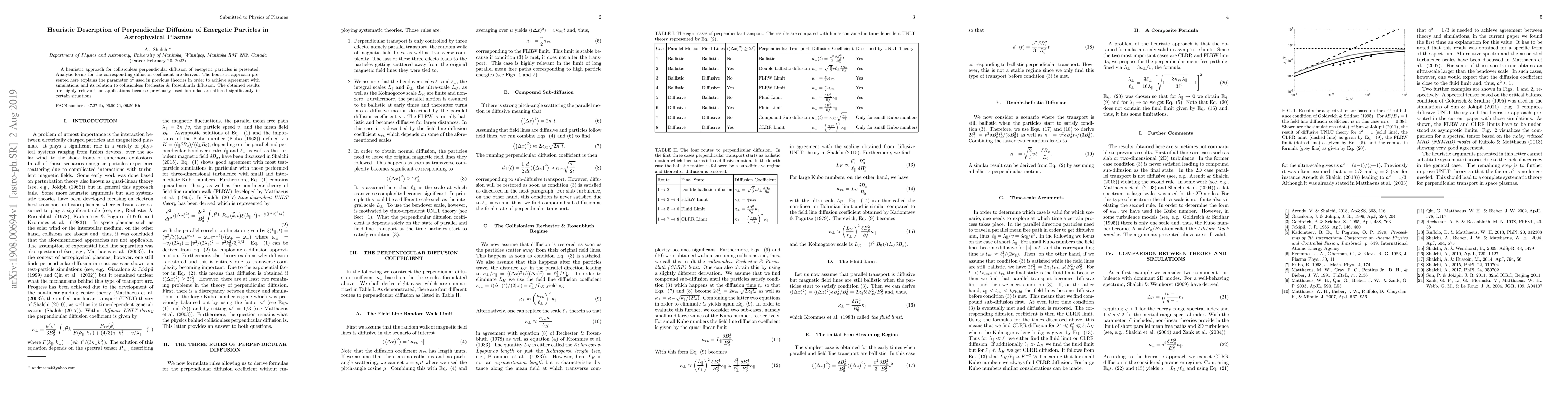 This paper introduces a heuristic method for understanding the perpendicular diffusion of energetic particles in astrophysical plasmas, deriving analytic forms for diffusion coefficients and explaining the parameter $a^2$ in previous theories, which is crucial for aligning theoretical models with simulation results. The findings significantly modify previously used formulas in specific scenarios.
