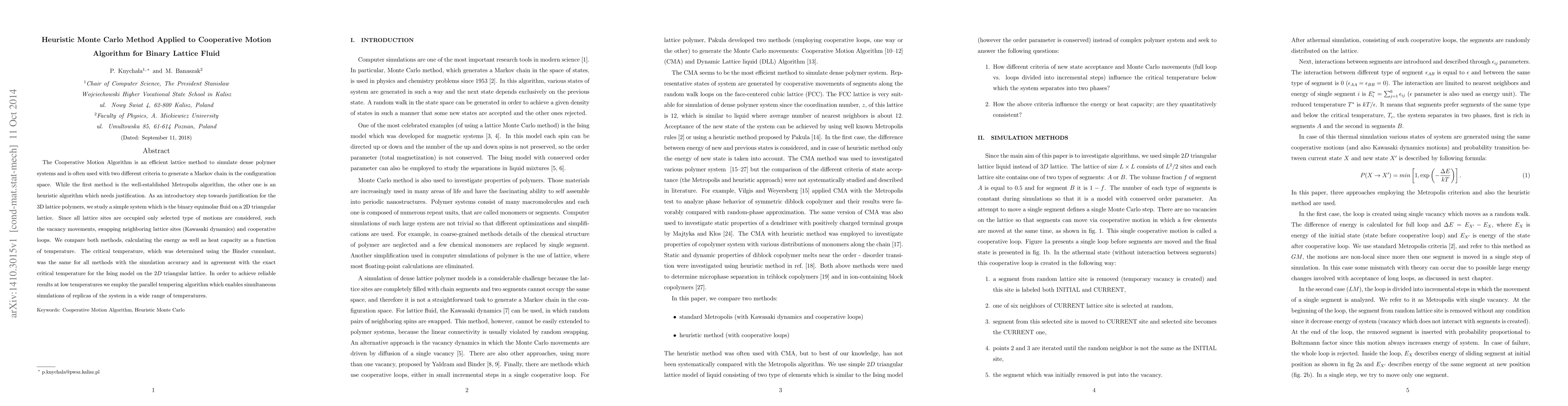 The Cooperative Motion Algorithm is an efficient lattice method to simulate dense polymer systems and is often used with two different criteria to generate a Markov chain in the configuration space. While the first method is the well-established Metropolis algorithm, the other one is an heuristic algorithm which needs justification. As an introductory step towards justification for the 3D lattice polymers, we study a simple system which is the binary equimolar uid on a 2D triangular lattice. Since all lattice sites are occupied only selected type of motions are considered, such the vacancy movements, swapping neighboring lattice sites (Kawasaki dynamics) and cooperative loops. We compare both methods, calculating the energy as well as heat capacity as a function of temperature. The critical temperature, which was determined using the Binder cumulant, was the same for all methods with the simulation accuracy and in agreement with the exact critical temperature for the Ising model on the 2D triangular lattice. In order to achieve reliable results at low temperatures we employ the parallel tempering algorithm which enables simultaneous simulations of replicas of the system in a wide range of temperatures.
