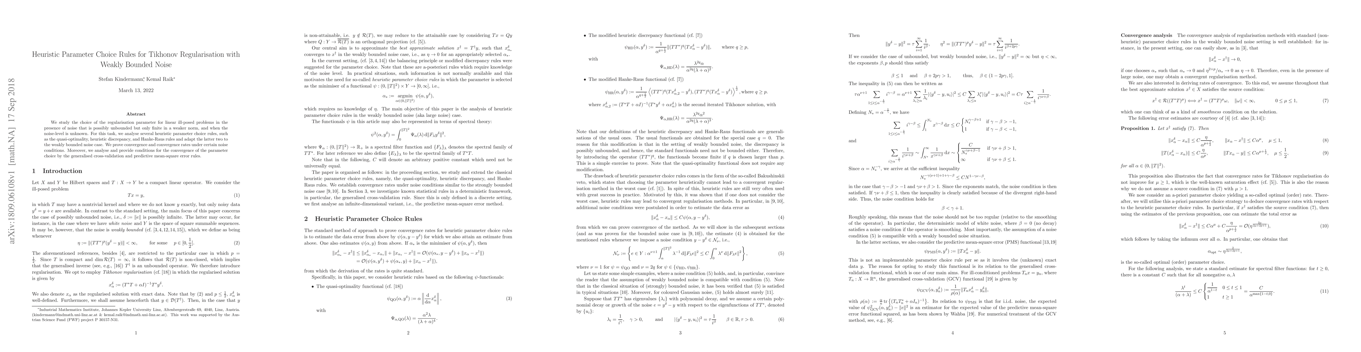 This paper investigates heuristic methods for selecting the regularisation parameter in linear ill-posed problems with weakly bounded noise, adapting the Hanke-Raus and generalised cross-validation rules for this context. It proves convergence and rates under specific noise conditions and provides conditions for the parameter choice convergence.