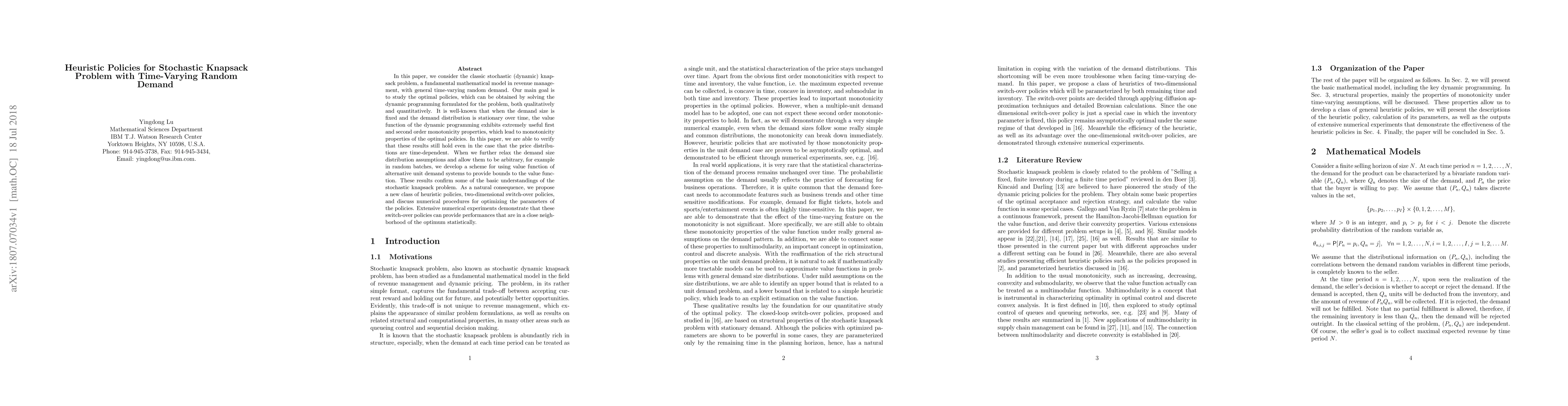 This paper explores heuristic policies for the stochastic knapsack problem with time-varying random demand, confirming the monotonicity properties of optimal policies even with time-dependent price distributions. The authors propose new two-dimensional switch-over heuristic policies, supported by numerical experiments showing their performance near the optimal solution.