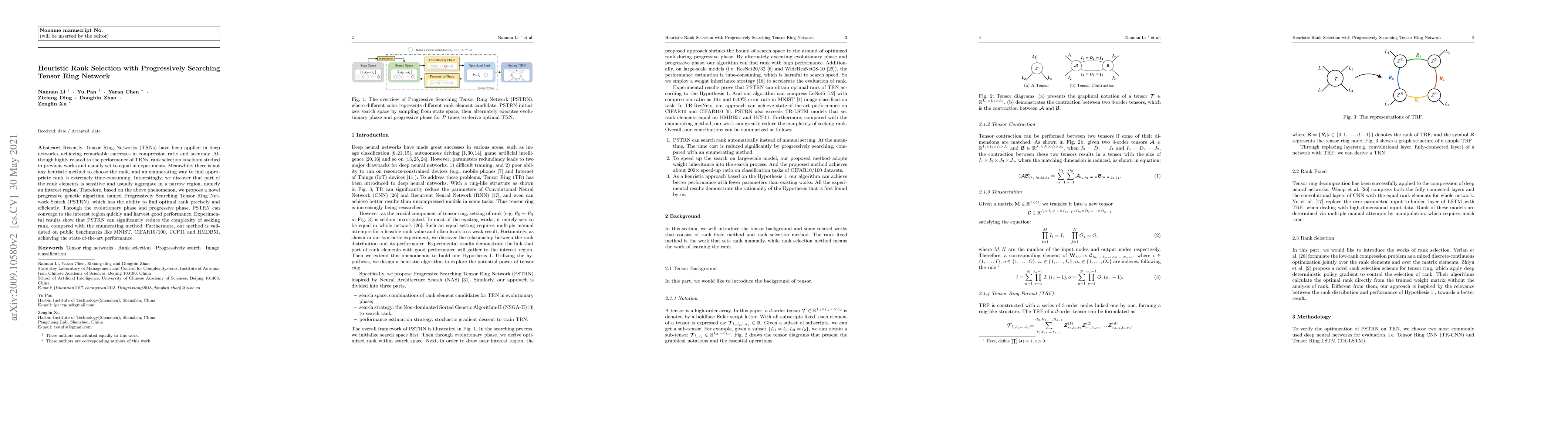 This paper proposes a novel heuristic method, Progressively Searching Tensor Ring Network Search (PSTRN), to efficiently determine optimal ranks for Tensor Ring Networks, significantly reducing complexity compared to traditional enumerating methods. The method leverages a genetic algorithm to quickly converge to an "interest region" of sensitive rank elements, achieving state-of-the-art performance on multiple benchmarks.