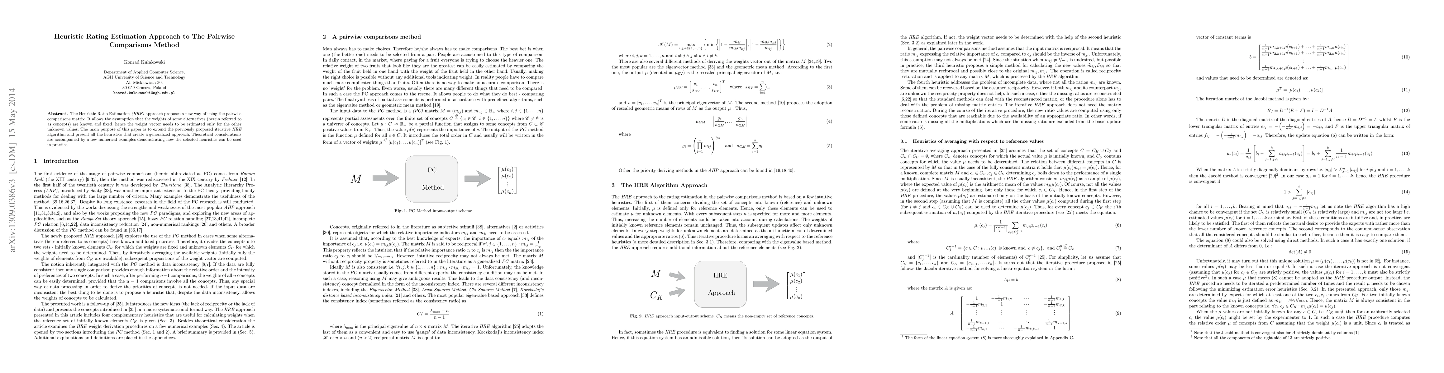 The Heuristic Ratio Estimation (HRE) approach proposes a new way of using the pairwise comparisons matrix. It allows the assumption that the weights of some alternatives (herein referred to as concepts) are known and fixed, hence the weight vector needs to be estimated only for the other unknown values. The main purpose of this paper is to extend the previously proposed iterative HRE algorithm and present all the heuristics that create a generalized approach. Theoretical considerations are accompanied by a few numerical examples demonstrating how the selected heuristics can be used in practice.