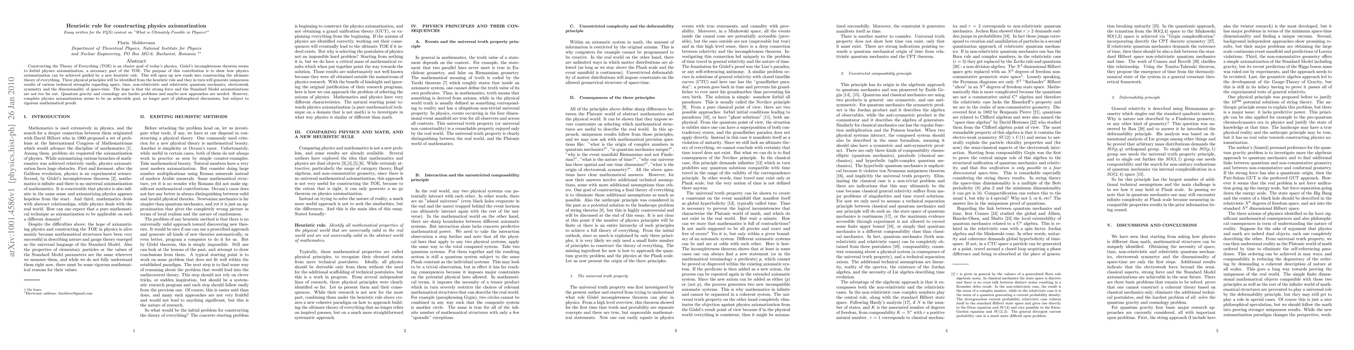 This paper proposes a new heuristic rule to achieve physics axiomatization, addressing the challenge posed by Goedel's incompleteness theorem. It aims to construct the Theory of Everything (TOE) by identifying three physical principles that generate unique results across various domains of physics, suggesting that complete axiomatization is a feasible goal.