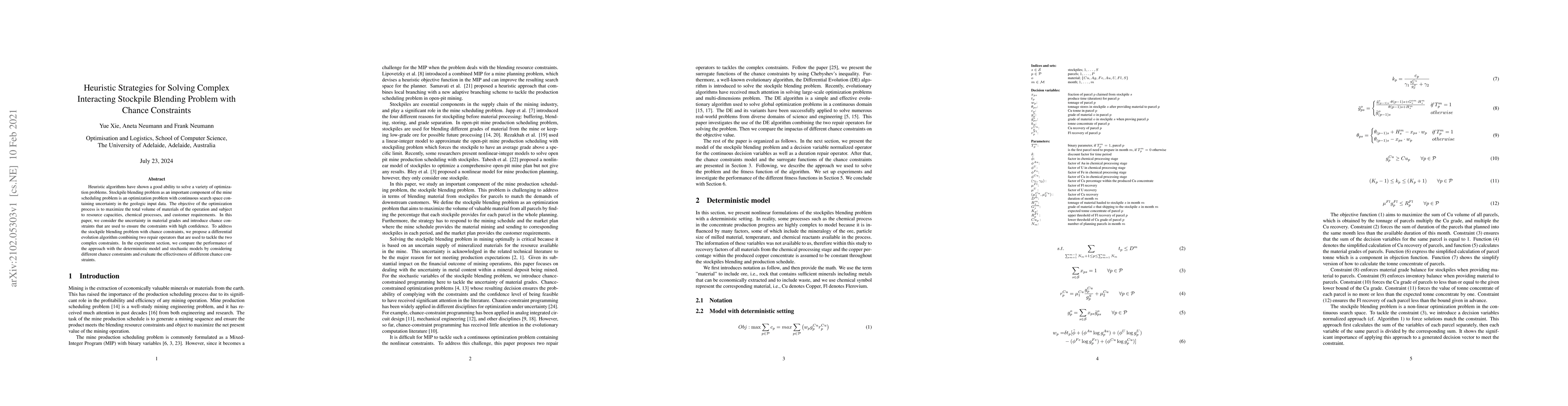 A new approach using a differential evolution algorithm with two repair operators tackles complex constraints in stockpile blending problems with chance constraints. The method outperforms traditional deterministic and stochastic models.