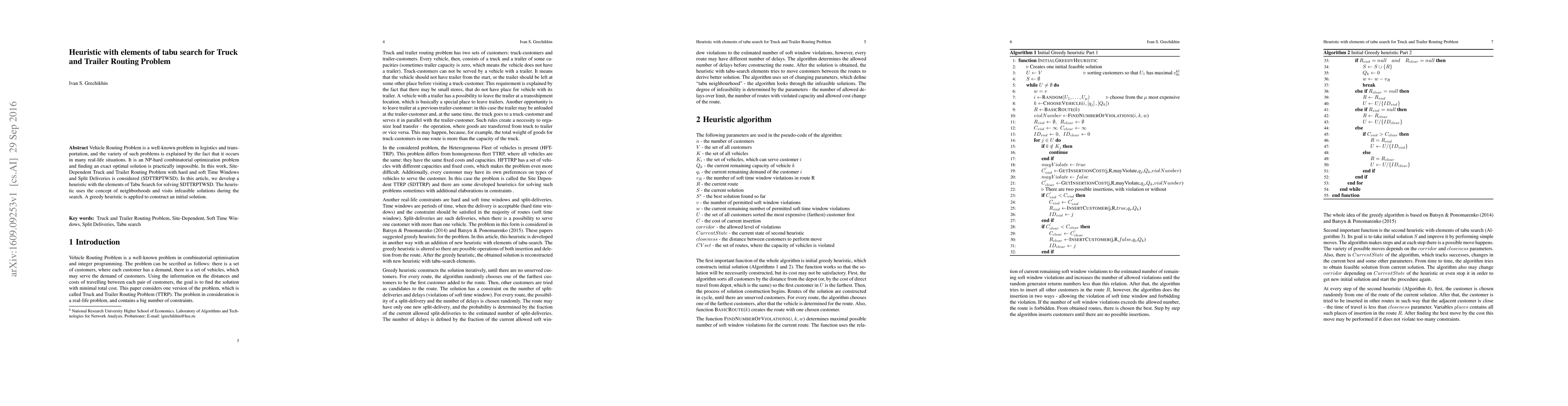 Vehicle Routing Problem is a well-known problem in logistics and transportation, and the variety of such problems is explained by the fact that it occurs in many real-life situations. It is an NP-hard combinatorial optimization problem and finding an exact optimal solution is practically impossible. In this work, Site-Dependent Truck and Trailer Routing Problem with hard and soft Time Windows and Split Deliveries is considered (SDTTRPTWSD). In this article, we develop a heuristic with the elements of Tabu Search for solving SDTTRPTWSD. The heuristic uses the concept of neighborhoods and visits infeasible solutions during the search. A greedy heuristic is applied to construct an initial solution.