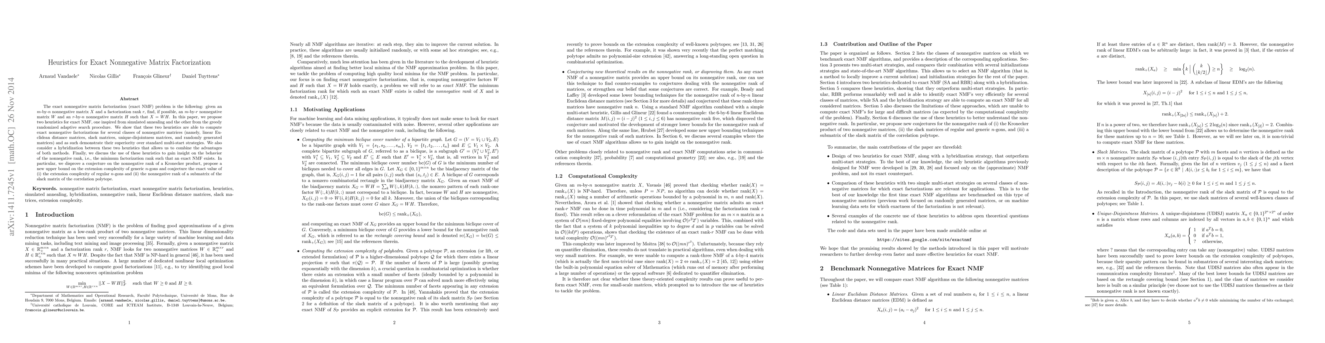 The exact nonnegative matrix factorization (exact NMF) problem is the following: given an $m$-by-$n$ nonnegative matrix $X$ and a factorization rank $r$, find, if possible, an $m$-by-$r$ nonnegative matrix $W$ and an $r$-by-$n$ nonnegative matrix $H$ such that $X = WH$. In this paper, we propose two heuristics for exact NMF, one inspired from simulated annealing and the other from the greedy randomized adaptive search procedure. We show that these two heuristics are able to compute exact nonnegative factorizations for several classes of nonnegative matrices (namely, linear Euclidean distance matrices, slack matrices, unique-disjointness matrices, and randomly generated matrices) and as such demonstrate their superiority over standard multi-start strategies. We also consider a hybridization between these two heuristics that allows us to combine the advantages of both methods. Finally, we discuss the use of these heuristics to gain insight on the behavior of the nonnegative rank, i.e., the minimum factorization rank such that an exact NMF exists. In particular, we disprove a conjecture on the nonnegative rank of a Kronecker product, propose a new upper bound on the extension complexity of generic $n$-gons and conjecture the exact value of (i) the extension complexity of regular $n$-gons and (ii) the nonnegative rank of a submatrix of the slack matrix of the correlation polytope.