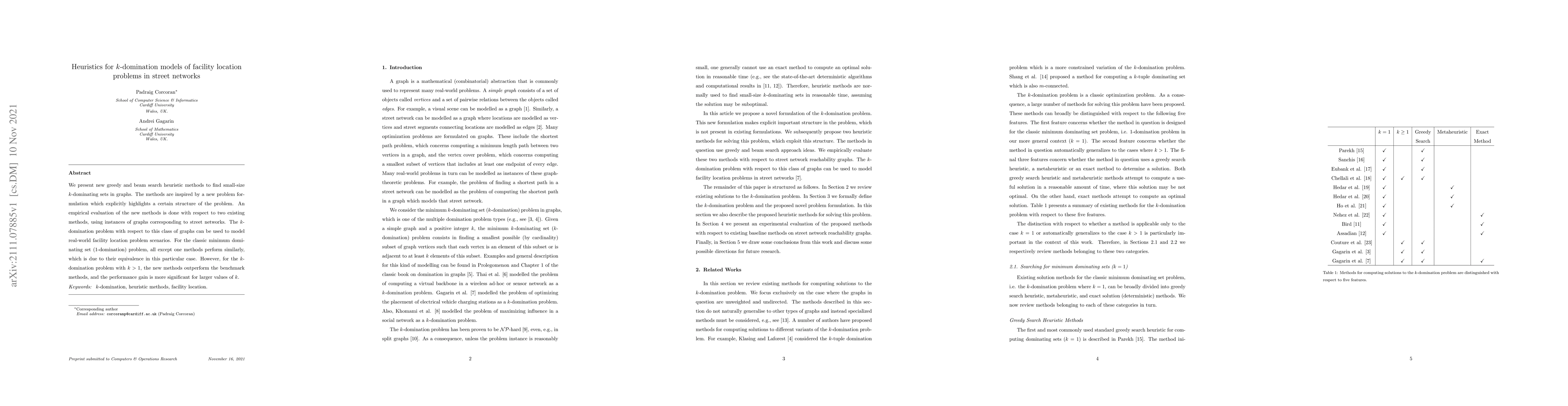 We present new greedy and beam search heuristic methods to find small-size $k$-dominating sets in graphs. The methods are inspired by a new problem formulation which explicitly highlights a certain structure of the problem. An empirical evaluation of the new methods is done with respect to two existing methods, using instances of graphs corresponding to street networks. The k-domination problem with respect to this class of graphs can be used to model real-world facility location problem scenarios. For the classic minimum dominating set ($1$-domination) problem, all except one methods perform similarly, which is due to their equivalence in this particular case. However, for the k-domination problem with k>1, the new methods outperform the benchmark methods, and the performance gain is more significant for larger values of k.