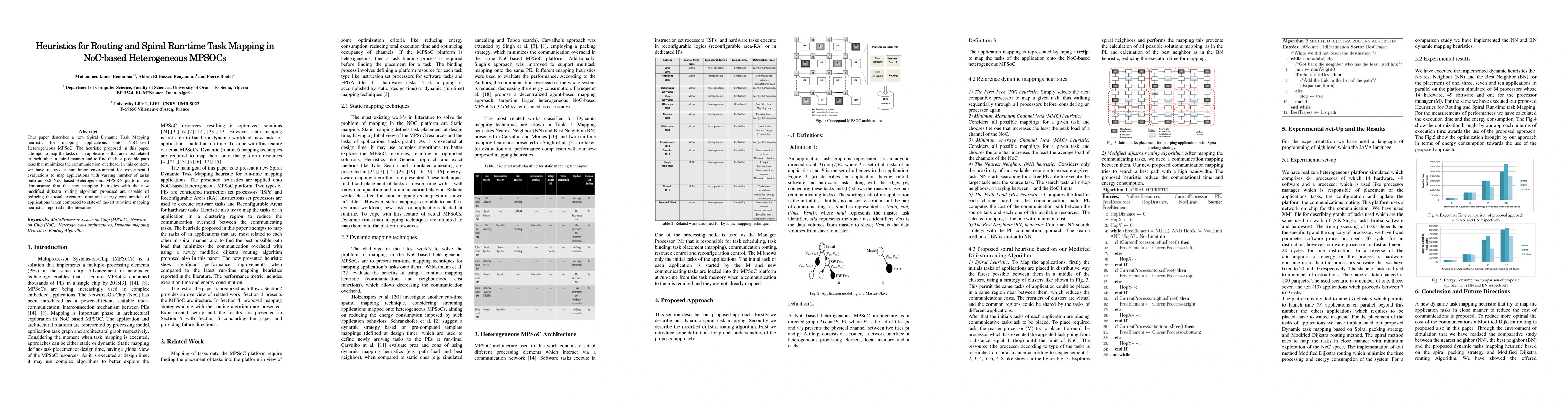 This paper describes a new Spiral Dynamic Task Mapping heuristic for mapping applications onto NoC-based Heterogeneous MPSoC. The heuristic proposed in this paper attempts to map the tasks of an applications that are most related to each other in spiral manner and to find the best possible path load that minimizes the communication overhead. In this context, we have realized a simulation environment for experimental evaluations to map applications with varying number of tasks onto an 8x8 NoC-based Heterogeneous MPSoCs platform, we demonstrate that the new mapping heuristics with the new modified dijkstra routing algorithm proposed are capable of reducing the total execution time and energy consumption of applications when compared to state-of the-art run-time mapping heuristics reported in the literature.