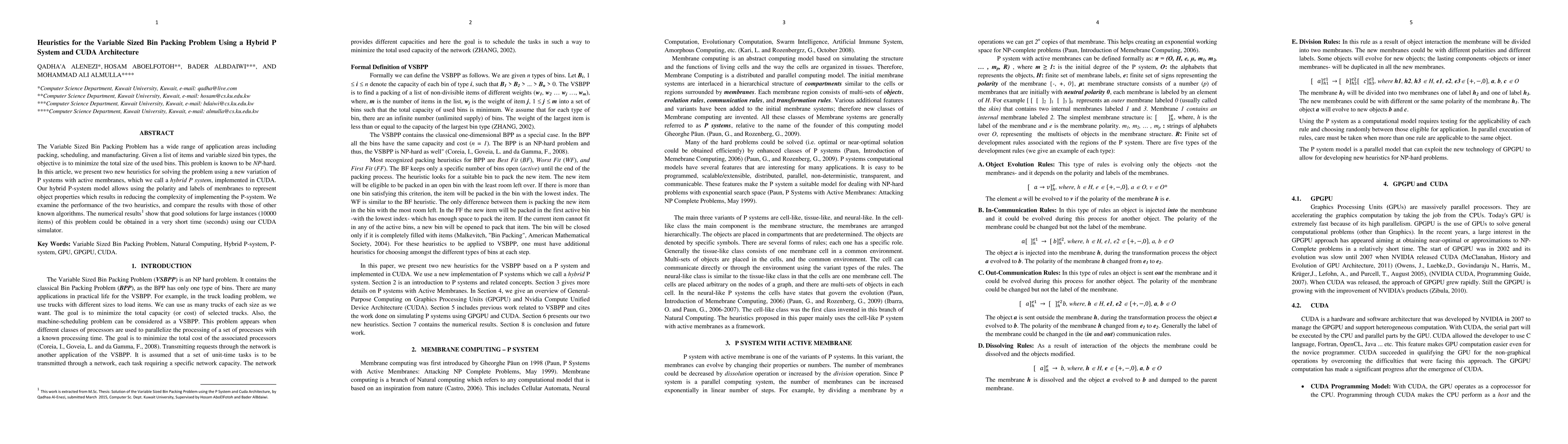 This paper introduces two heuristics for solving the Variable Sized Bin Packing Problem using a hybrid P-system implemented in CUDA. The proposed approach leverages the complexity reduction from the hybrid P-system model, achieving efficient solutions for large instances within seconds.