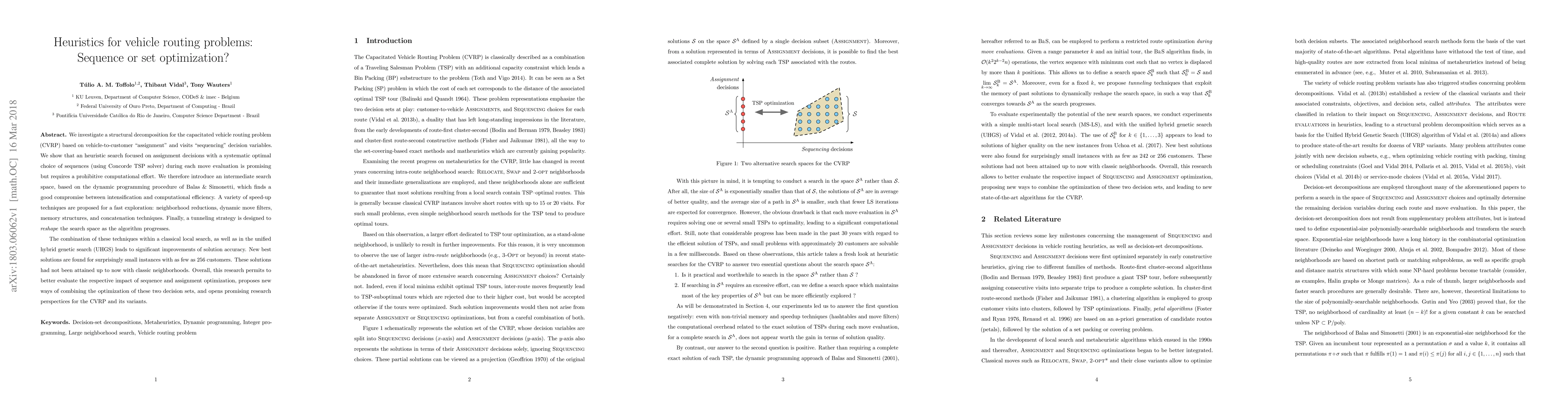 We investigate a structural decomposition for the capacitated vehicle routing problem (CVRP) based on vehicle-to-customer "assignment" and visits "sequencing" decision variables. We show that an heuristic search focused on assignment decisions with a systematic optimal choice of sequences (using Concorde TSP solver) during each move evaluation is promising but requires a prohibitive computational effort. We therefore introduce an intermediate search space, based on the dynamic programming procedure of Balas & Simonetti, which finds a good compromise between intensification and computational efficiency. A variety of speed-up techniques are proposed for a fast exploration: neighborhood reductions, dynamic move filters, memory structures, and concatenation techniques. Finally, a tunneling strategy is designed to reshape the search space as the algorithm progresses. The combination of these techniques within a classical local search, as well as in the unified hybrid genetic search (UHGS) leads to significant improvements of solution accuracy. New best solutions are found for surprisingly small instances with as few as 256 customers. These solutions had not been attained up to now with classic neighborhoods. Overall, this research permits to better evaluate the respective impact of sequence and assignment optimization, proposes new ways of combining the optimization of these two decision sets, and opens promising research perspectives for the CVRP and its variants.