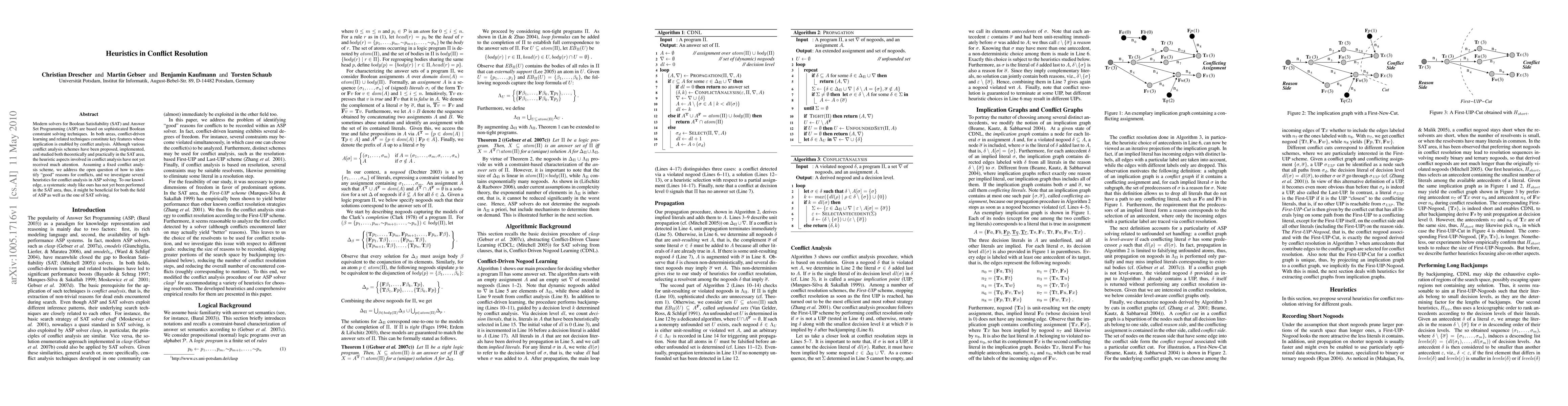 The paper proposes and empirically studies several heuristics for conflict resolution in ASP solving, focusing on different goals such as recording short nogoods, performing long backjumps, and shortening conflict resolution.