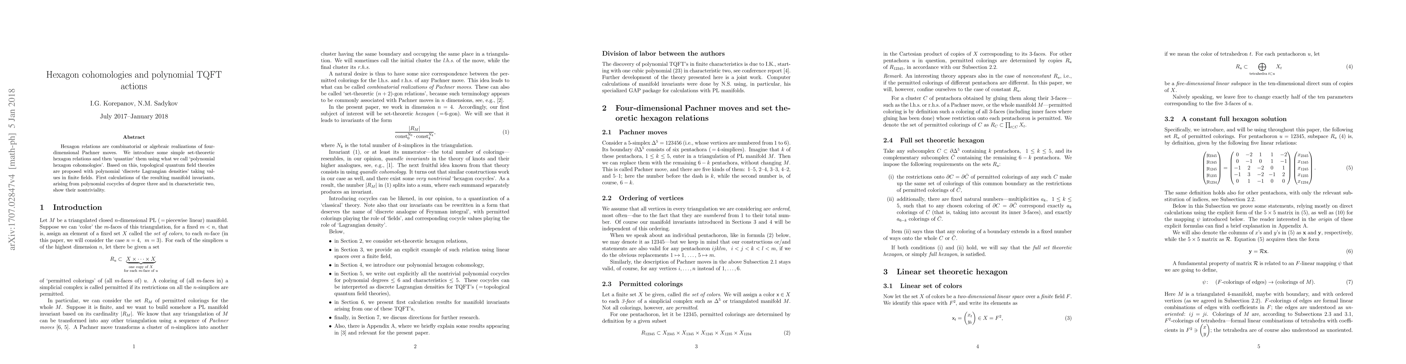 Hexagon relations are combinatorial or algebraic realizations of four-dimensional Pachner moves. We introduce some simple set-theoretic hexagon relations and then `quantize' them using what we call `polynomial hexagon cohomologies'. Based on this, topological quantum field theories are proposed with polynomial `discrete Lagrangian densities' taking values in finite fields. First calculations of the resulting manifold invariants, arising from polynomial cocycles of degree three and in characteristic two, show their nontriviality.