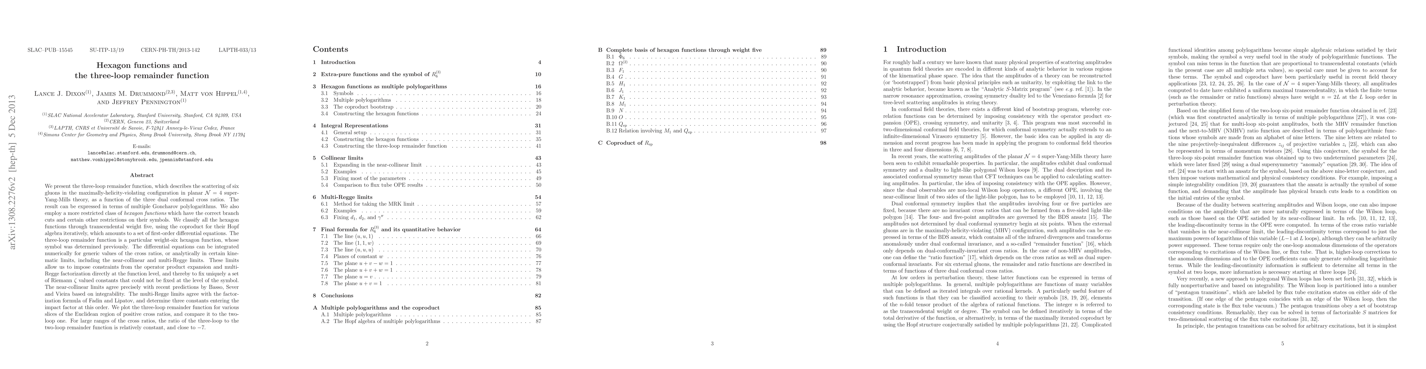 We present the three-loop remainder function, which describes the scattering of six gluons in the maximally-helicity-violating configuration in planar N=4 super-Yang-Mills theory, as a function of the three dual conformal cross ratios. The result can be expressed in terms of multiple Goncharov polylogarithms. We also employ a more restricted class of "hexagon functions" which have the correct branch cuts and certain other restrictions on their symbols. We classify all the hexagon functions through transcendental weight five, using the coproduct for their Hopf algebra iteratively, which amounts to a set of first-order differential equations. The three-loop remainder function is a particular weight-six hexagon function, whose symbol was determined previously. The differential equations can be integrated numerically for generic values of the cross ratios, or analytically in certain kinematics limits, including the near-collinear and multi-Regge limits. These limits allow us to impose constraints from the operator product expansion and multi-Regge factorization directly at the function level, and thereby to fix uniquely a set of Riemann-zeta-valued constants that could not be fixed at the level of the symbol. The near-collinear limits agree precisely with recent predictions by Basso, Sever and Vieira based on integrability. The multi-Regge limits agree with the factorization formula of Fadin and Lipatov, and determine three constants entering the impact factor at this order. We plot the three-loop remainder function for various slices of the Euclidean region of positive cross ratios, and compare it to the two-loop one. For large ranges of the cross ratios, the ratio of the three-loop to the two-loop remainder function is relatively constant, and close to -7.