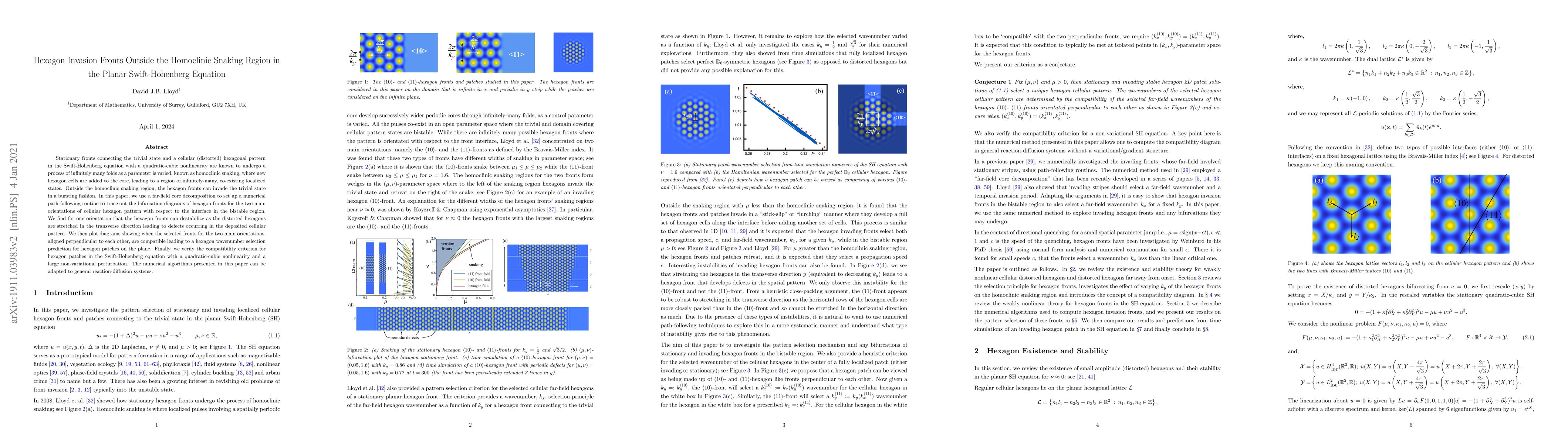 This paper investigates hexagon fronts in the Swift-Hohenberg equation outside the homoclinic snaking region, revealing their invasion dynamics and defect formation. It employs numerical path-following to trace bifurcation diagrams and predicts hexagon wavenumber selection, verifying the compatibility criterion for hexagon patches.