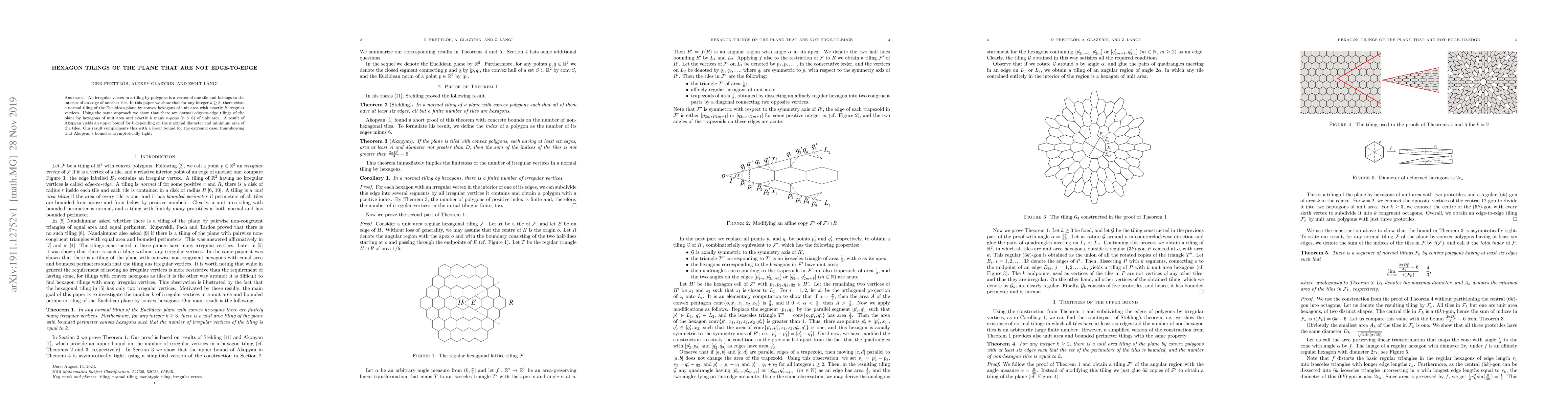 The paper shows that for any integer k >= 3, there exists a normal tiling of the plane by convex hexagons with exactly k irregular vertices, providing a lower bound for the extremal case of Akopyan's bound.